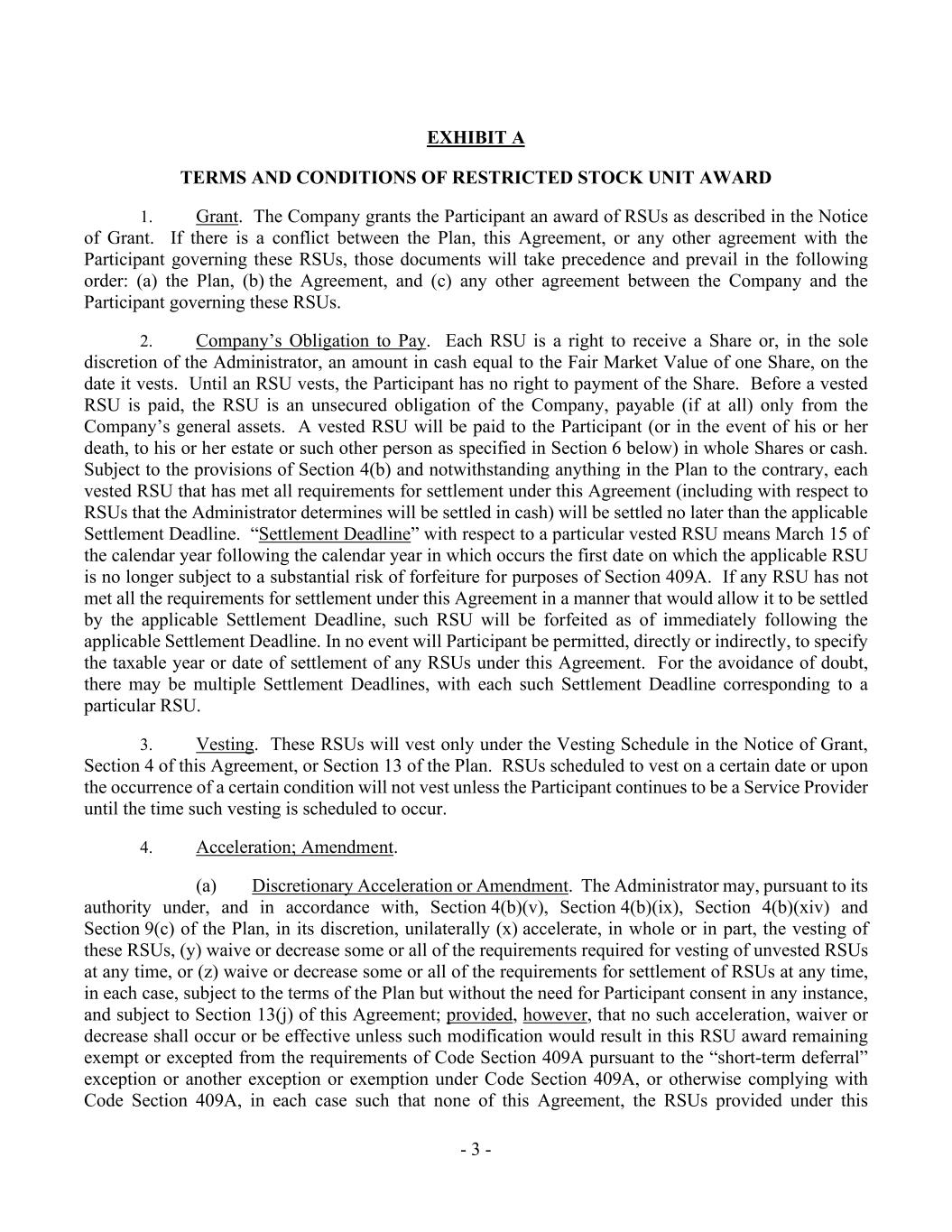 - 3 - EXHIBIT A TERMS AND CONDITIONS OF RESTRICTED STOCK UNIT AWARD 1. Grant. The Company grants the Participant an award of RSUs as described in the Notice of Grant. If there is a conflict between the Plan, this Agreement, or any other agreement with the Participant governing these RSUs, those documents will take precedence and prevail in the following order: (a) the Plan, (b) the Agreement, and (c) any other agreement between the Company and the Participant governing these RSUs. 2. Company’s Obligation to Pay. Each RSU is a right to receive a Share or, in the sole discretion of the Administrator, an amount in cash equal to the Fair Market Value of one Share, on the date it vests. Until an RSU vests, the Participant has no right to payment of the Share. Before a vested RSU is paid, the RSU is an unsecured obligation of the Company, payable (if at all) only from the Company’s general assets. A vested RSU will be paid to the Participant (or in the event of his or her death, to his or her estate or such other person as specified in Section 6 below) in whole Shares or cash. Subject to the provisions of Section 4(b) and notwithstanding anything in the Plan to the contrary, each vested RSU that has met all requirements for settlement under this Agreement (including with respect to RSUs that the Administrator determines will be settled in cash) will be settled no later than the applicable Settlement Deadline. “Settlement Deadline” with respect to a particular vested RSU means March 15 of the calendar year following the calendar year in which occurs the first date on which the applicable RSU is no longer subject to a substantial risk of forfeiture for purposes of Section 409A. If any RSU has not met all the requirements for settlement under this Agreement in a manner that would allow it to be settled by the applicable Settlement Deadline, such RSU will be forfeited as of immediately following the applicable Settlement Deadline. In no event will Participant be permitted, directly or indirectly, to specify the taxable year or date of settlement of any RSUs under this Agreement. For the avoidance of doubt, there may be multiple Settlement Deadlines, with each such Settlement Deadline corresponding to a particular RSU. 3. Vesting. These RSUs will vest only under the Vesting Schedule in the Notice of Grant, Section 4 of this Agreement, or Section 13 of the Plan. RSUs scheduled to vest on a certain date or upon the occurrence of a certain condition will not vest unless the Participant continues to be a Service Provider until the time such vesting is scheduled to occur. 4. Acceleration; Amendment. (a) Discretionary Acceleration or Amendment. The Administrator may, pursuant to its authority under, and in accordance with, Section 4(b)(v), Section 4(b)(ix), Section 4(b)(xiv) and Section 9(c) of the Plan, in its discretion, unilaterally (x) accelerate, in whole or in part, the vesting of these RSUs, (y) waive or decrease some or all of the requirements required for vesting of unvested RSUs at any time, or (z) waive or decrease some or all of the requirements for settlement of RSUs at any time, in each case, subject to the terms of the Plan but without the need for Participant consent in any instance, and subject to Section 13(j) of this Agreement; provided, however, that no such acceleration, waiver or decrease shall occur or be effective unless such modification would result in this RSU award remaining exempt or excepted from the requirements of Code Section 409A pursuant to the “short-term deferral” exception or another exception or exemption under Code Section 409A, or otherwise complying with Code Section 409A, in each case such that none of this Agreement, the RSUs provided under this