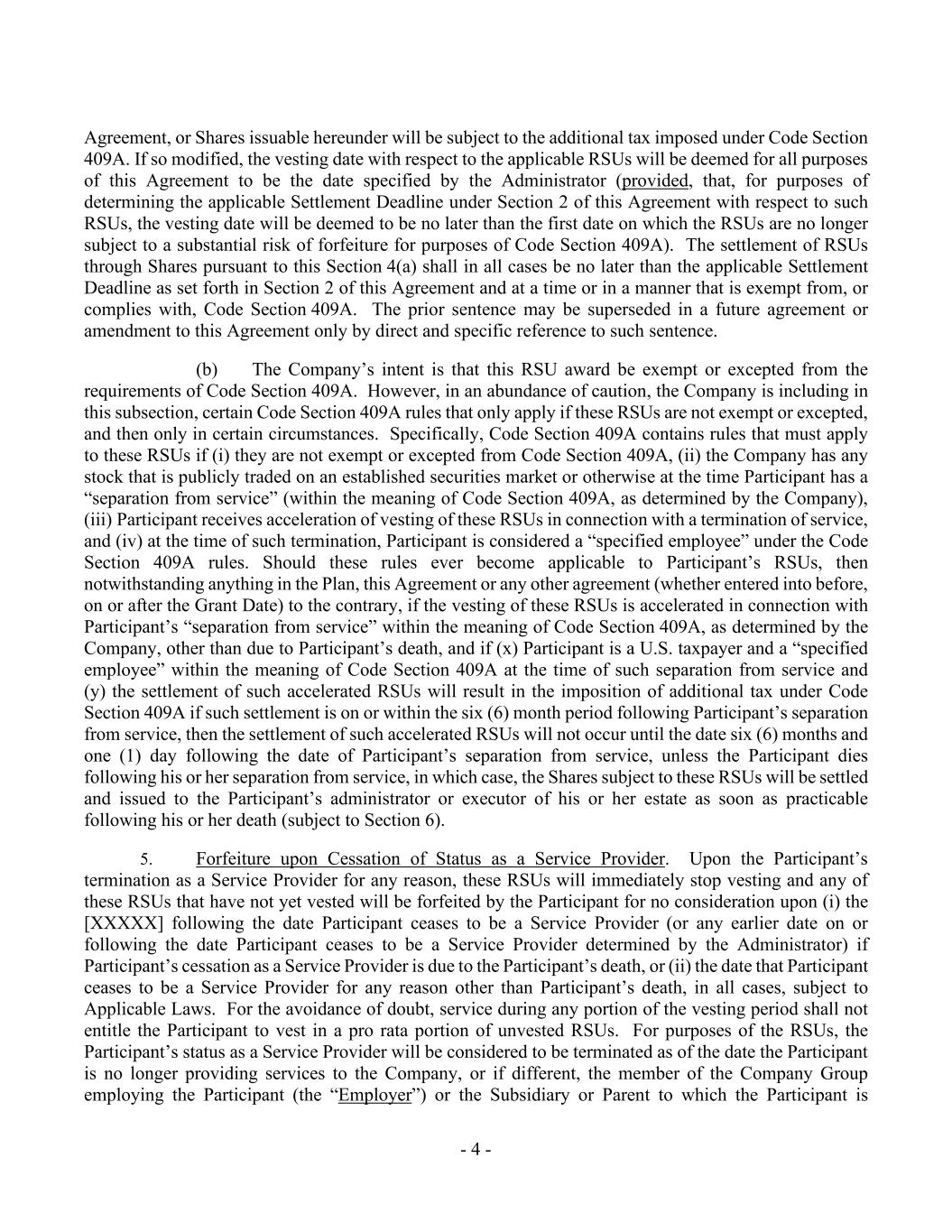 - 4 - Agreement, or Shares issuable hereunder will be subject to the additional tax imposed under Code Section 409A. If so modified, the vesting date with respect to the applicable RSUs will be deemed for all purposes of this Agreement to be the date specified by the Administrator (provided, that, for purposes of determining the applicable Settlement Deadline under Section 2 of this Agreement with respect to such RSUs, the vesting date will be deemed to be no later than the first date on which the RSUs are no longer subject to a substantial risk of forfeiture for purposes of Code Section 409A). The settlement of RSUs through Shares pursuant to this Section 4(a) shall in all cases be no later than the applicable Settlement Deadline as set forth in Section 2 of this Agreement and at a time or in a manner that is exempt from, or complies with, Code Section 409A. The prior sentence may be superseded in a future agreement or amendment to this Agreement only by direct and specific reference to such sentence. (b) The Company’s intent is that this RSU award be exempt or excepted from the requirements of Code Section 409A. However, in an abundance of caution, the Company is including in this subsection, certain Code Section 409A rules that only apply if these RSUs are not exempt or excepted, and then only in certain circumstances. Specifically, Code Section 409A contains rules that must apply to these RSUs if (i) they are not exempt or excepted from Code Section 409A, (ii) the Company has any stock that is publicly traded on an established securities market or otherwise at the time Participant has a “separation from service” (within the meaning of Code Section 409A, as determined by the Company), (iii) Participant receives acceleration of vesting of these RSUs in connection with a termination of service, and (iv) at the time of such termination, Participant is considered a “specified employee” under the Code Section 409A rules. Should these rules ever become applicable to Participant’s RSUs, then notwithstanding anything in the Plan, this Agreement or any other agreement (whether entered into before, on or after the Grant Date) to the contrary, if the vesting of these RSUs is accelerated in connection with Participant’s “separation from service” within the meaning of Code Section 409A, as determined by the Company, other than due to Participant’s death, and if (x) Participant is a U.S. taxpayer and a “specified employee” within the meaning of Code Section 409A at the time of such separation from service and (y) the settlement of such accelerated RSUs will result in the imposition of additional tax under Code Section 409A if such settlement is on or within the six (6) month period following Participant’s separation from service, then the settlement of such accelerated RSUs will not occur until the date six (6) months and one (1) day following the date of Participant’s separation from service, unless the Participant dies following his or her separation from service, in which case, the Shares subject to these RSUs will be settled and issued to the Participant’s administrator or executor of his or her estate as soon as practicable following his or her death (subject to Section 6). 5. Forfeiture upon Cessation of Status as a Service Provider. Upon the Participant’s termination as a Service Provider for any reason, these RSUs will immediately stop vesting and any of these RSUs that have not yet vested will be forfeited by the Participant for no consideration upon (i) the [XXXXX] following the date Participant ceases to be a Service Provider (or any earlier date on or following the date Participant ceases to be a Service Provider determined by the Administrator) if Participant’s cessation as a Service Provider is due to the Participant’s death, or (ii) the date that Participant ceases to be a Service Provider for any reason other than Participant’s death, in all cases, subject to Applicable Laws. For the avoidance of doubt, service during any portion of the vesting period shall not entitle the Participant to vest in a pro rata portion of unvested RSUs. For purposes of the RSUs, the Participant’s status as a Service Provider will be considered to be terminated as of the date the Participant is no longer providing services to the Company, or if different, the member of the Company Group employing the Participant (the “Employer”) or the Subsidiary or Parent to which the Participant is