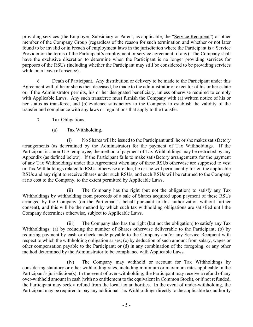 - 5 - providing services (the Employer, Subsidiary or Parent, as applicable, the “Service Recipient”) or other member of the Company Group (regardless of the reason for such termination and whether or not later found to be invalid or in breach of employment laws in the jurisdiction where the Participant is a Service Provider or the terms of the Participant’s employment or service agreement, if any). The Company shall have the exclusive discretion to determine when the Participant is no longer providing services for purposes of the RSUs (including whether the Participant may still be considered to be providing services while on a leave of absence). 6. Death of Participant. Any distribution or delivery to be made to the Participant under this Agreement will, if he or she is then deceased, be made to the administrator or executor of his or her estate or, if the Administrator permits, his or her designated beneficiary, unless otherwise required to comply with Applicable Laws. Any such transferee must furnish the Company with (a) written notice of his or her status as transferee, and (b) evidence satisfactory to the Company to establish the validity of the transfer and compliance with any laws or regulations that apply to the transfer. 7. Tax Obligations. (a) Tax Withholding. (i) No Shares will be issued to the Participant until he or she makes satisfactory arrangements (as determined by the Administrator) for the payment of Tax Withholdings. If the Participant is a non-U.S. employee, the method of payment of Tax Withholdings may be restricted by any Appendix (as defined below). If the Participant fails to make satisfactory arrangements for the payment of any Tax Withholdings under this Agreement when any of these RSUs otherwise are supposed to vest or Tax Withholdings related to RSUs otherwise are due, he or she will permanently forfeit the applicable RSUs and any right to receive Shares under such RSUs, and such RSUs will be returned to the Company at no cost to the Company, to the extent permitted by Applicable Laws. (ii) The Company has the right (but not the obligation) to satisfy any Tax Withholdings by withholding from proceeds of a sale of Shares acquired upon payment of these RSUs arranged by the Company (on the Participant’s behalf pursuant to this authorization without further consent), and this will be the method by which such tax withholding obligations are satisfied until the Company determines otherwise, subject to Applicable Laws. (iii) The Company also has the right (but not the obligation) to satisfy any Tax Withholdings: (a) by reducing the number of Shares otherwise deliverable to the Participant; (b) by requiring payment by cash or check made payable to the Company and/or any Service Recipient with respect to which the withholding obligation arises; (c) by deduction of such amount from salary, wages or other compensation payable to the Participant; or (d) in any combination of the foregoing, or any other method determined by the Administrator to be compliance with Applicable Laws. (iv) The Company may withhold or account for Tax Withholdings by considering statutory or other withholding rates, including minimum or maximum rates applicable in the Participant’s jurisdiction(s). In the event of over-withholding, the Participant may receive a refund of any over-withheld amount in cash (with no entitlement to the equivalent in Common Stock), or if not refunded, the Participant may seek a refund from the local tax authorities. In the event of under-withholding, the Participant may be required to pay any additional Tax Withholdings directly to the applicable tax authority