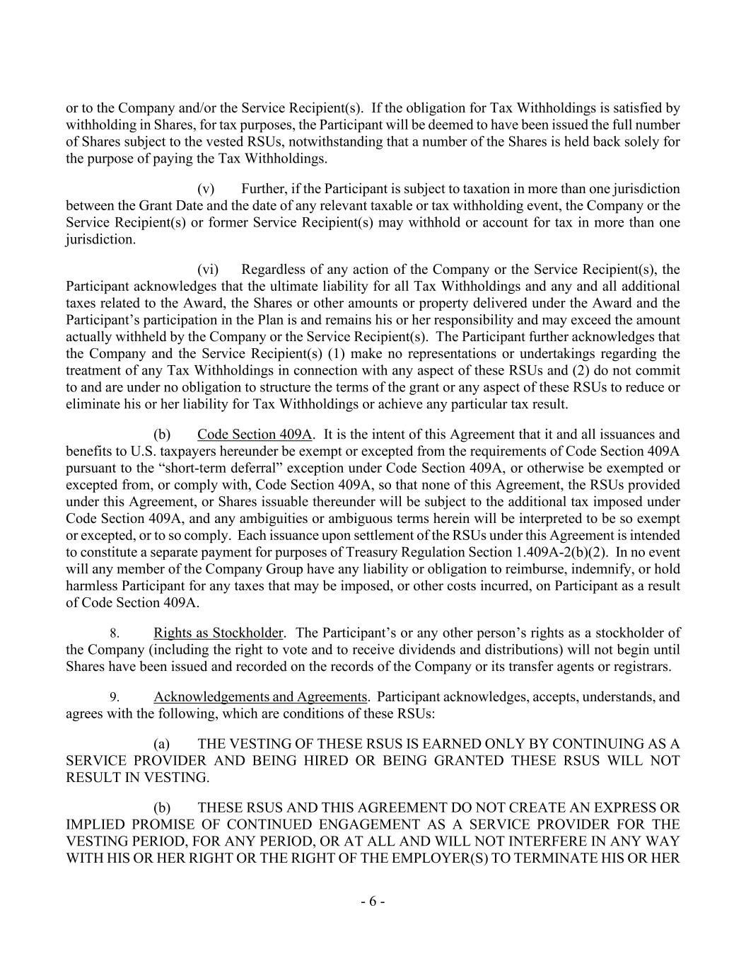 - 6 - or to the Company and/or the Service Recipient(s). If the obligation for Tax Withholdings is satisfied by withholding in Shares, for tax purposes, the Participant will be deemed to have been issued the full number of Shares subject to the vested RSUs, notwithstanding that a number of the Shares is held back solely for the purpose of paying the Tax Withholdings. (v) Further, if the Participant is subject to taxation in more than one jurisdiction between the Grant Date and the date of any relevant taxable or tax withholding event, the Company or the Service Recipient(s) or former Service Recipient(s) may withhold or account for tax in more than one jurisdiction. (vi) Regardless of any action of the Company or the Service Recipient(s), the Participant acknowledges that the ultimate liability for all Tax Withholdings and any and all additional taxes related to the Award, the Shares or other amounts or property delivered under the Award and the Participant’s participation in the Plan is and remains his or her responsibility and may exceed the amount actually withheld by the Company or the Service Recipient(s). The Participant further acknowledges that the Company and the Service Recipient(s) (1) make no representations or undertakings regarding the treatment of any Tax Withholdings in connection with any aspect of these RSUs and (2) do not commit to and are under no obligation to structure the terms of the grant or any aspect of these RSUs to reduce or eliminate his or her liability for Tax Withholdings or achieve any particular tax result. (b) Code Section 409A. It is the intent of this Agreement that it and all issuances and benefits to U.S. taxpayers hereunder be exempt or excepted from the requirements of Code Section 409A pursuant to the “short-term deferral” exception under Code Section 409A, or otherwise be exempted or excepted from, or comply with, Code Section 409A, so that none of this Agreement, the RSUs provided under this Agreement, or Shares issuable thereunder will be subject to the additional tax imposed under Code Section 409A, and any ambiguities or ambiguous terms herein will be interpreted to be so exempt or excepted, or to so comply. Each issuance upon settlement of the RSUs under this Agreement is intended to constitute a separate payment for purposes of Treasury Regulation Section 1.409A-2(b)(2). In no event will any member of the Company Group have any liability or obligation to reimburse, indemnify, or hold harmless Participant for any taxes that may be imposed, or other costs incurred, on Participant as a result of Code Section 409A. 8. Rights as Stockholder. The Participant’s or any other person’s rights as a stockholder of the Company (including the right to vote and to receive dividends and distributions) will not begin until Shares have been issued and recorded on the records of the Company or its transfer agents or registrars. 9. Acknowledgements and Agreements. Participant acknowledges, accepts, understands, and agrees with the following, which are conditions of these RSUs: (a) THE VESTING OF THESE RSUS IS EARNED ONLY BY CONTINUING AS A SERVICE PROVIDER AND BEING HIRED OR BEING GRANTED THESE RSUS WILL NOT RESULT IN VESTING. (b) THESE RSUS AND THIS AGREEMENT DO NOT CREATE AN EXPRESS OR IMPLIED PROMISE OF CONTINUED ENGAGEMENT AS A SERVICE PROVIDER FOR THE VESTING PERIOD, FOR ANY PERIOD, OR AT ALL AND WILL NOT INTERFERE IN ANY WAY WITH HIS OR HER RIGHT OR THE RIGHT OF THE EMPLOYER(S) TO TERMINATE HIS OR HER