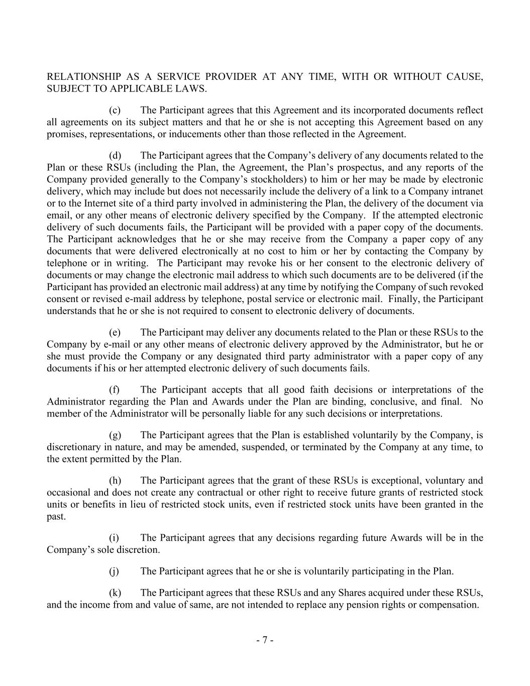 - 7 - RELATIONSHIP AS A SERVICE PROVIDER AT ANY TIME, WITH OR WITHOUT CAUSE, SUBJECT TO APPLICABLE LAWS. (c) The Participant agrees that this Agreement and its incorporated documents reflect all agreements on its subject matters and that he or she is not accepting this Agreement based on any promises, representations, or inducements other than those reflected in the Agreement. (d) The Participant agrees that the Company’s delivery of any documents related to the Plan or these RSUs (including the Plan, the Agreement, the Plan’s prospectus, and any reports of the Company provided generally to the Company’s stockholders) to him or her may be made by electronic delivery, which may include but does not necessarily include the delivery of a link to a Company intranet or to the Internet site of a third party involved in administering the Plan, the delivery of the document via email, or any other means of electronic delivery specified by the Company. If the attempted electronic delivery of such documents fails, the Participant will be provided with a paper copy of the documents. The Participant acknowledges that he or she may receive from the Company a paper copy of any documents that were delivered electronically at no cost to him or her by contacting the Company by telephone or in writing. The Participant may revoke his or her consent to the electronic delivery of documents or may change the electronic mail address to which such documents are to be delivered (if the Participant has provided an electronic mail address) at any time by notifying the Company of such revoked consent or revised e-mail address by telephone, postal service or electronic mail. Finally, the Participant understands that he or she is not required to consent to electronic delivery of documents. (e) The Participant may deliver any documents related to the Plan or these RSUs to the Company by e-mail or any other means of electronic delivery approved by the Administrator, but he or she must provide the Company or any designated third party administrator with a paper copy of any documents if his or her attempted electronic delivery of such documents fails. (f) The Participant accepts that all good faith decisions or interpretations of the Administrator regarding the Plan and Awards under the Plan are binding, conclusive, and final. No member of the Administrator will be personally liable for any such decisions or interpretations. (g) The Participant agrees that the Plan is established voluntarily by the Company, is discretionary in nature, and may be amended, suspended, or terminated by the Company at any time, to the extent permitted by the Plan. (h) The Participant agrees that the grant of these RSUs is exceptional, voluntary and occasional and does not create any contractual or other right to receive future grants of restricted stock units or benefits in lieu of restricted stock units, even if restricted stock units have been granted in the past. (i) The Participant agrees that any decisions regarding future Awards will be in the Company’s sole discretion. (j) The Participant agrees that he or she is voluntarily participating in the Plan. (k) The Participant agrees that these RSUs and any Shares acquired under these RSUs, and the income from and value of same, are not intended to replace any pension rights or compensation.