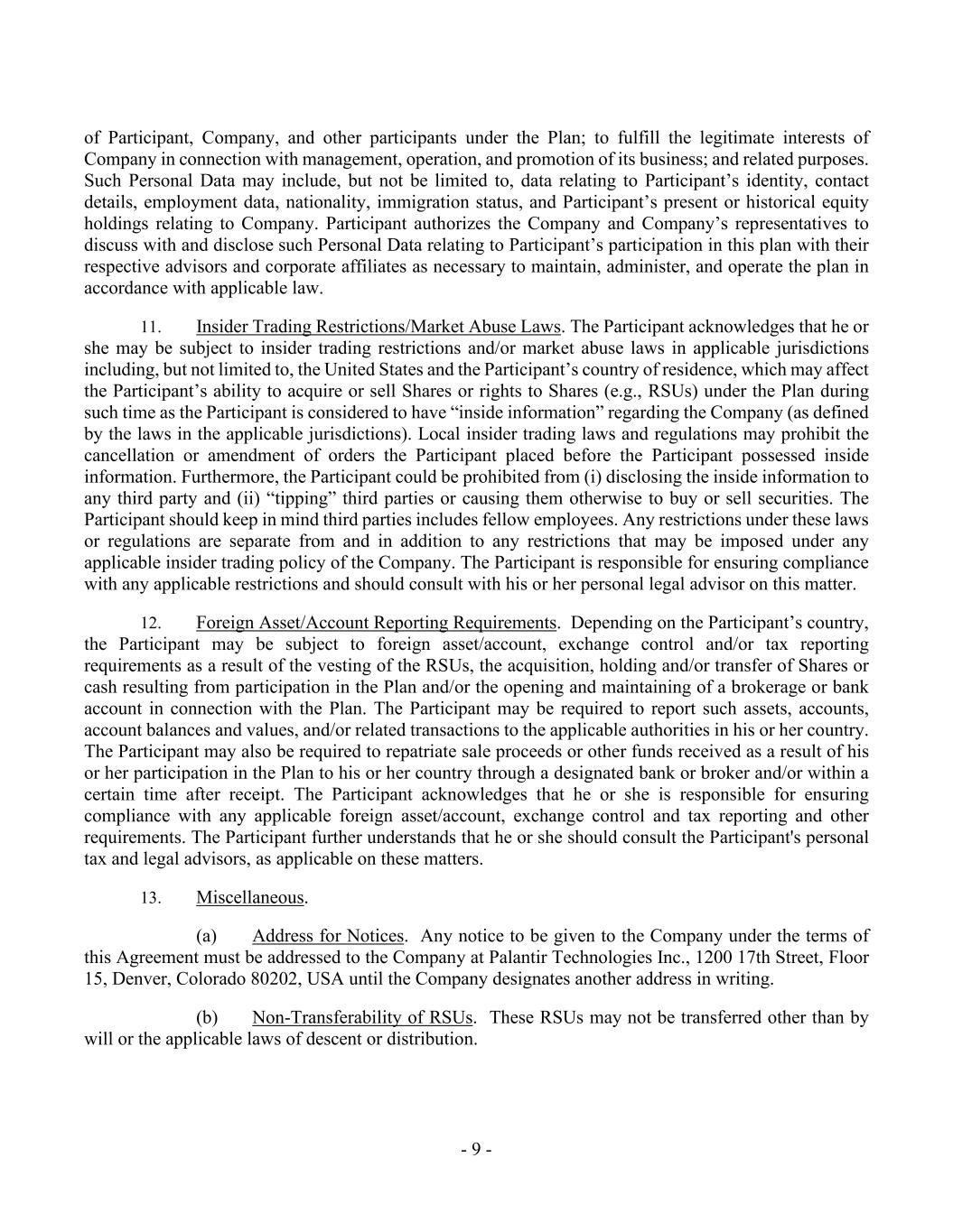 - 9 - of Participant, Company, and other participants under the Plan; to fulfill the legitimate interests of Company in connection with management, operation, and promotion of its business; and related purposes. Such Personal Data may include, but not be limited to, data relating to Participant’s identity, contact details, employment data, nationality, immigration status, and Participant’s present or historical equity holdings relating to Company. Participant authorizes the Company and Company’s representatives to discuss with and disclose such Personal Data relating to Participant’s participation in this plan with their respective advisors and corporate affiliates as necessary to maintain, administer, and operate the plan in accordance with applicable law. 11. Insider Trading Restrictions/Market Abuse Laws. The Participant acknowledges that he or she may be subject to insider trading restrictions and/or market abuse laws in applicable jurisdictions including, but not limited to, the United States and the Participant’s country of residence, which may affect the Participant’s ability to acquire or sell Shares or rights to Shares (e.g., RSUs) under the Plan during such time as the Participant is considered to have “inside information” regarding the Company (as defined by the laws in the applicable jurisdictions). Local insider trading laws and regulations may prohibit the cancellation or amendment of orders the Participant placed before the Participant possessed inside information. Furthermore, the Participant could be prohibited from (i) disclosing the inside information to any third party and (ii) “tipping” third parties or causing them otherwise to buy or sell securities. The Participant should keep in mind third parties includes fellow employees. Any restrictions under these laws or regulations are separate from and in addition to any restrictions that may be imposed under any applicable insider trading policy of the Company. The Participant is responsible for ensuring compliance with any applicable restrictions and should consult with his or her personal legal advisor on this matter. 12. Foreign Asset/Account Reporting Requirements. Depending on the Participant’s country, the Participant may be subject to foreign asset/account, exchange control and/or tax reporting requirements as a result of the vesting of the RSUs, the acquisition, holding and/or transfer of Shares or cash resulting from participation in the Plan and/or the opening and maintaining of a brokerage or bank account in connection with the Plan. The Participant may be required to report such assets, accounts, account balances and values, and/or related transactions to the applicable authorities in his or her country. The Participant may also be required to repatriate sale proceeds or other funds received as a result of his or her participation in the Plan to his or her country through a designated bank or broker and/or within a certain time after receipt. The Participant acknowledges that he or she is responsible for ensuring compliance with any applicable foreign asset/account, exchange control and tax reporting and other requirements. The Participant further understands that he or she should consult the Participant's personal tax and legal advisors, as applicable on these matters. 13. Miscellaneous. (a) Address for Notices. Any notice to be given to the Company under the terms of this Agreement must be addressed to the Company at Palantir Technologies Inc., 1200 17th Street, Floor 15, Denver, Colorado 80202, USA until the Company designates another address in writing. (b) Non-Transferability of RSUs. These RSUs may not be transferred other than by will or the applicable laws of descent or distribution.