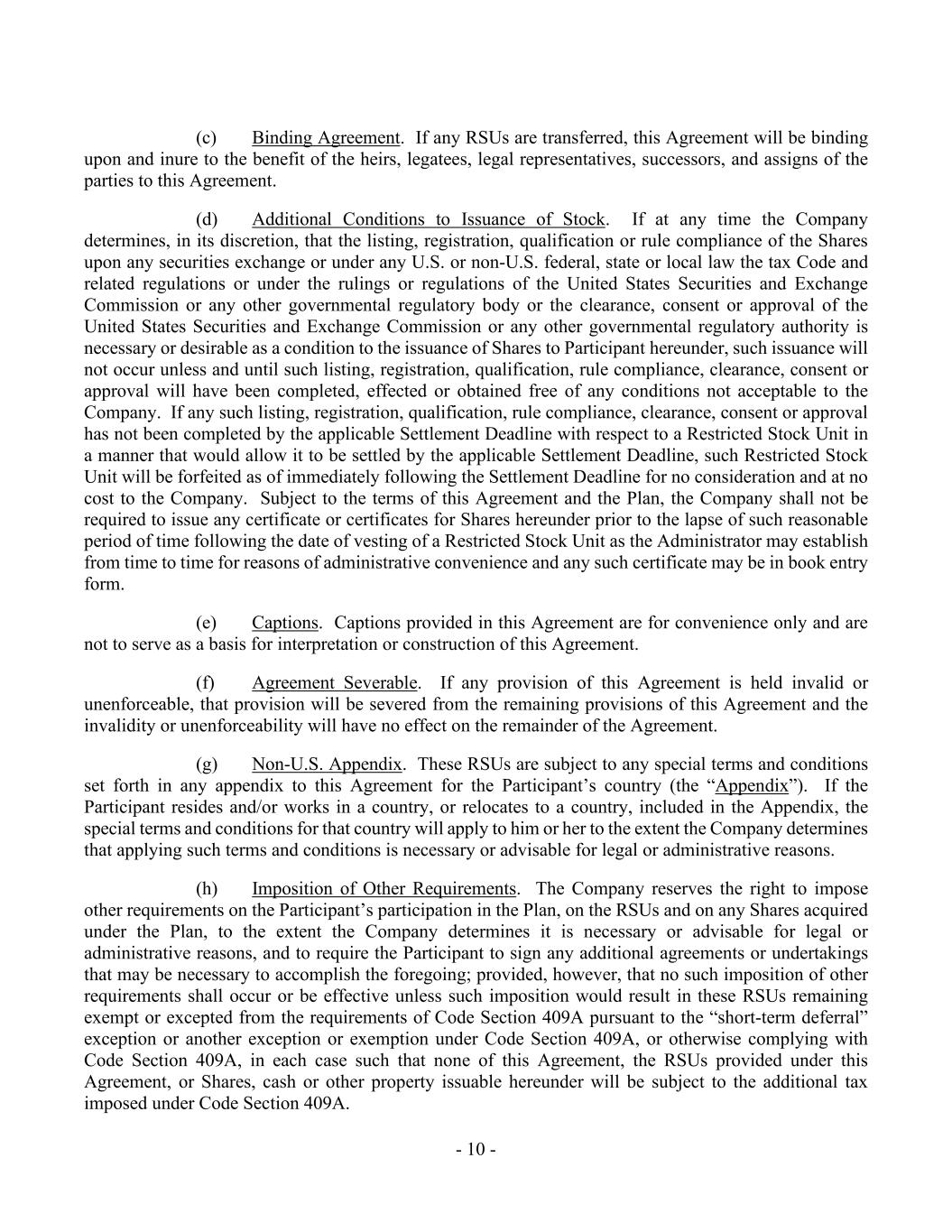 - 10 - (c) Binding Agreement. If any RSUs are transferred, this Agreement will be binding upon and inure to the benefit of the heirs, legatees, legal representatives, successors, and assigns of the parties to this Agreement. (d) Additional Conditions to Issuance of Stock. If at any time the Company determines, in its discretion, that the listing, registration, qualification or rule compliance of the Shares upon any securities exchange or under any U.S. or non-U.S. federal, state or local law the tax Code and related regulations or under the rulings or regulations of the United States Securities and Exchange Commission or any other governmental regulatory body or the clearance, consent or approval of the United States Securities and Exchange Commission or any other governmental regulatory authority is necessary or desirable as a condition to the issuance of Shares to Participant hereunder, such issuance will not occur unless and until such listing, registration, qualification, rule compliance, clearance, consent or approval will have been completed, effected or obtained free of any conditions not acceptable to the Company. If any such listing, registration, qualification, rule compliance, clearance, consent or approval has not been completed by the applicable Settlement Deadline with respect to a Restricted Stock Unit in a manner that would allow it to be settled by the applicable Settlement Deadline, such Restricted Stock Unit will be forfeited as of immediately following the Settlement Deadline for no consideration and at no cost to the Company. Subject to the terms of this Agreement and the Plan, the Company shall not be required to issue any certificate or certificates for Shares hereunder prior to the lapse of such reasonable period of time following the date of vesting of a Restricted Stock Unit as the Administrator may establish from time to time for reasons of administrative convenience and any such certificate may be in book entry form. (e) Captions. Captions provided in this Agreement are for convenience only and are not to serve as a basis for interpretation or construction of this Agreement. (f) Agreement Severable. If any provision of this Agreement is held invalid or unenforceable, that provision will be severed from the remaining provisions of this Agreement and the invalidity or unenforceability will have no effect on the remainder of the Agreement. (g) Non-U.S. Appendix. These RSUs are subject to any special terms and conditions set forth in any appendix to this Agreement for the Participant’s country (the “Appendix”). If the Participant resides and/or works in a country, or relocates to a country, included in the Appendix, the special terms and conditions for that country will apply to him or her to the extent the Company determines that applying such terms and conditions is necessary or advisable for legal or administrative reasons. (h) Imposition of Other Requirements. The Company reserves the right to impose other requirements on the Participant’s participation in the Plan, on the RSUs and on any Shares acquired under the Plan, to the extent the Company determines it is necessary or advisable for legal or administrative reasons, and to require the Participant to sign any additional agreements or undertakings that may be necessary to accomplish the foregoing; provided, however, that no such imposition of other requirements shall occur or be effective unless such imposition would result in these RSUs remaining exempt or excepted from the requirements of Code Section 409A pursuant to the “short-term deferral” exception or another exception or exemption under Code Section 409A, or otherwise complying with Code Section 409A, in each case such that none of this Agreement, the RSUs provided under this Agreement, or Shares, cash or other property issuable hereunder will be subject to the additional tax imposed under Code Section 409A.