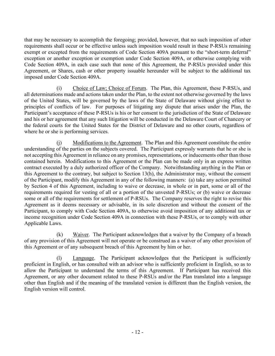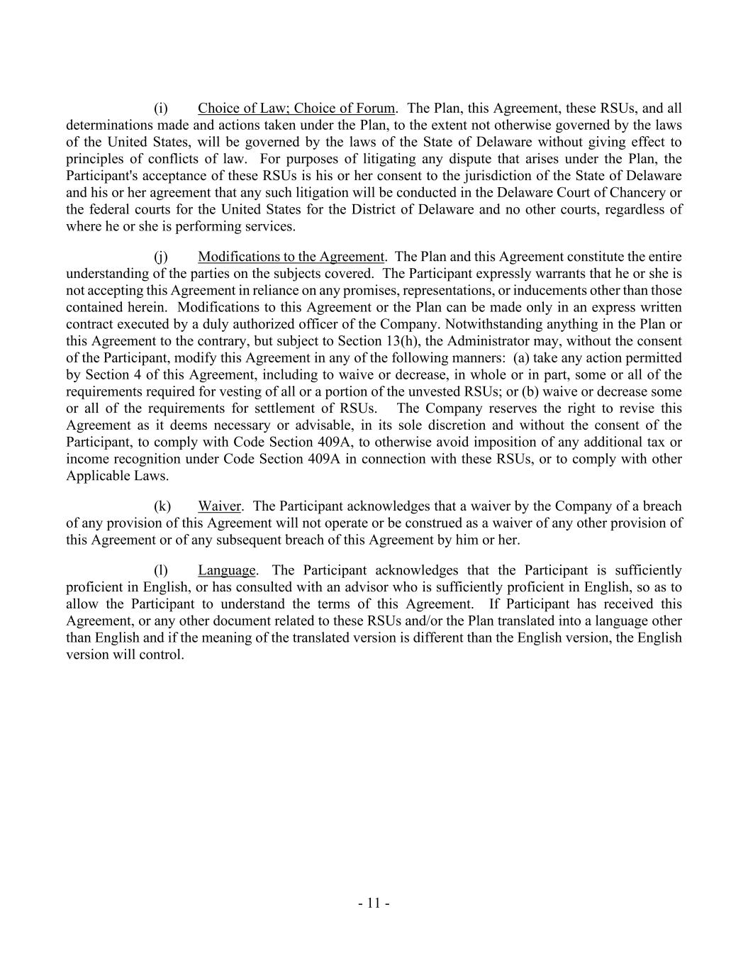 - 11 - (i) Choice of Law; Choice of Forum. The Plan, this Agreement, these RSUs, and all determinations made and actions taken under the Plan, to the extent not otherwise governed by the laws of the United States, will be governed by the laws of the State of Delaware without giving effect to principles of conflicts of law. For purposes of litigating any dispute that arises under the Plan, the Participant's acceptance of these RSUs is his or her consent to the jurisdiction of the State of Delaware and his or her agreement that any such litigation will be conducted in the Delaware Court of Chancery or the federal courts for the United States for the District of Delaware and no other courts, regardless of where he or she is performing services. (j) Modifications to the Agreement. The Plan and this Agreement constitute the entire understanding of the parties on the subjects covered. The Participant expressly warrants that he or she is not accepting this Agreement in reliance on any promises, representations, or inducements other than those contained herein. Modifications to this Agreement or the Plan can be made only in an express written contract executed by a duly authorized officer of the Company. Notwithstanding anything in the Plan or this Agreement to the contrary, but subject to Section 13(h), the Administrator may, without the consent of the Participant, modify this Agreement in any of the following manners: (a) take any action permitted by Section 4 of this Agreement, including to waive or decrease, in whole or in part, some or all of the requirements required for vesting of all or a portion of the unvested RSUs; or (b) waive or decrease some or all of the requirements for settlement of RSUs. The Company reserves the right to revise this Agreement as it deems necessary or advisable, in its sole discretion and without the consent of the Participant, to comply with Code Section 409A, to otherwise avoid imposition of any additional tax or income recognition under Code Section 409A in connection with these RSUs, or to comply with other Applicable Laws. (k) Waiver. The Participant acknowledges that a waiver by the Company of a breach of any provision of this Agreement will not operate or be construed as a waiver of any other provision of this Agreement or of any subsequent breach of this Agreement by him or her. (l) Language. The Participant acknowledges that the Participant is sufficiently proficient in English, or has consulted with an advisor who is sufficiently proficient in English, so as to allow the Participant to understand the terms of this Agreement. If Participant has received this Agreement, or any other document related to these RSUs and/or the Plan translated into a language other than English and if the meaning of the translated version is different than the English version, the English version will control.