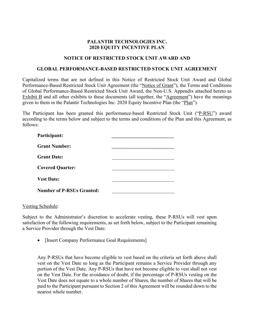 PALANTIR TECHNOLOGIES INC. 2020 EQUITY INCENTIVE PLAN NOTICE OF RESTRICTED STOCK UNIT AWARD AND GLOBAL PERFORMANCE-BASED RESTRICTED STOCK UNIT AGREEMENT Capitalized terms that are not defined in this Notice of Restricted Stock Unit Award and Global Performance-Based Restricted Stock Unit Agreement (the “Notice of Grant”), the Terms and Conditions of Global Performance-Based Restricted Stock Unit Award, the Non-U.S. Appendix attached hereto as Exhibit B and all other exhibits to these documents (all together, the “Agreement”) have the meanings given to them in the Palantir Technologies Inc. 2020 Equity Incentive Plan (the “Plan”). The Participant has been granted this performance-based Restricted Stock Unit (“P-RSU”) award according to the terms below and subject to the terms and conditions of the Plan and this Agreement, as follows: Participant: _________________________ Grant Number: _________________________ Grant Date: _________________________ Covered Quarter: _________________________ Vest Date: _________________________ Number of P-RSUs Granted: _________________________ Vesting Schedule: Subject to the Administrator’s discretion to accelerate vesting, these P-RSUs will vest upon satisfaction of the following requirements, as set forth below, subject to the Participant remaining a Service Provider through the Vest Date: • [Insert Company Performance Goal Requirements] Any P-RSUs that have become eligible to vest based on the criteria set forth above shall vest on the Vest Date so long as the Participant remains a Service Provider through any portion of the Vest Date. Any P-RSUs that have not become eligible to vest shall not vest on the Vest Date. For the avoidance of doubt, if the percentage of P-RSUs vesting on the Vest Date does not equate to a whole number of Shares, the number of Shares that will be paid to the Participant pursuant to Section 2 of this Agreement will be rounded down to the nearest whole number.