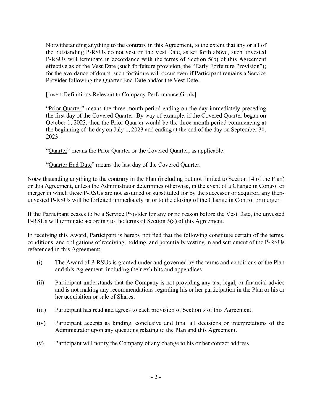 - 2 - Notwithstanding anything to the contrary in this Agreement, to the extent that any or all of the outstanding P-RSUs do not vest on the Vest Date, as set forth above, such unvested P-RSUs will terminate in accordance with the terms of Section 5(b) of this Agreement effective as of the Vest Date (such forfeiture provision, the “Early Forfeiture Provision”); for the avoidance of doubt, such forfeiture will occur even if Participant remains a Service Provider following the Quarter End Date and/or the Vest Date. [Insert Definitions Relevant to Company Performance Goals] “Prior Quarter” means the three-month period ending on the day immediately preceding the first day of the Covered Quarter. By way of example, if the Covered Quarter began on October 1, 2023, then the Prior Quarter would be the three-month period commencing at the beginning of the day on July 1, 2023 and ending at the end of the day on September 30, 2023. “Quarter” means the Prior Quarter or the Covered Quarter, as applicable. “Quarter End Date” means the last day of the Covered Quarter. Notwithstanding anything to the contrary in the Plan (including but not limited to Section 14 of the Plan) or this Agreement, unless the Administrator determines otherwise, in the event of a Change in Control or merger in which these P-RSUs are not assumed or substituted for by the successor or acquiror, any then- unvested P-RSUs will be forfeited immediately prior to the closing of the Change in Control or merger. If the Participant ceases to be a Service Provider for any or no reason before the Vest Date, the unvested P-RSUs will terminate according to the terms of Section 5(a) of this Agreement. In receiving this Award, Participant is hereby notified that the following constitute certain of the terms, conditions, and obligations of receiving, holding, and potentially vesting in and settlement of the P-RSUs referenced in this Agreement: (i) The Award of P-RSUs is granted under and governed by the terms and conditions of the Plan and this Agreement, including their exhibits and appendices. (ii) Participant understands that the Company is not providing any tax, legal, or financial advice and is not making any recommendations regarding his or her participation in the Plan or his or her acquisition or sale of Shares. (iii) Participant has read and agrees to each provision of Section 9 of this Agreement. (iv) Participant accepts as binding, conclusive and final all decisions or interpretations of the Administrator upon any questions relating to the Plan and this Agreement. (v) Participant will notify the Company of any change to his or her contact address.
