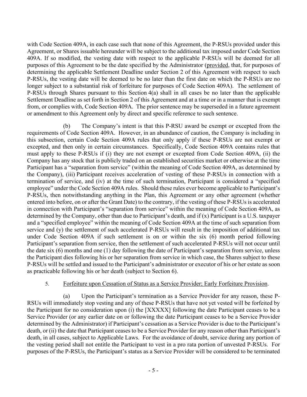 - 5 - with Code Section 409A, in each case such that none of this Agreement, the P-RSUs provided under this Agreement, or Shares issuable hereunder will be subject to the additional tax imposed under Code Section 409A. If so modified, the vesting date with respect to the applicable P-RSUs will be deemed for all purposes of this Agreement to be the date specified by the Administrator (provided, that, for purposes of determining the applicable Settlement Deadline under Section 2 of this Agreement with respect to such P-RSUs, the vesting date will be deemed to be no later than the first date on which the P-RSUs are no longer subject to a substantial risk of forfeiture for purposes of Code Section 409A). The settlement of P-RSUs through Shares pursuant to this Section 4(a) shall in all cases be no later than the applicable Settlement Deadline as set forth in Section 2 of this Agreement and at a time or in a manner that is exempt from, or complies with, Code Section 409A. The prior sentence may be superseded in a future agreement or amendment to this Agreement only by direct and specific reference to such sentence. (b) The Company’s intent is that this P-RSU award be exempt or excepted from the requirements of Code Section 409A. However, in an abundance of caution, the Company is including in this subsection, certain Code Section 409A rules that only apply if these P-RSUs are not exempt or excepted, and then only in certain circumstances. Specifically, Code Section 409A contains rules that must apply to these P-RSUs if (i) they are not exempt or excepted from Code Section 409A, (ii) the Company has any stock that is publicly traded on an established securities market or otherwise at the time Participant has a “separation from service” (within the meaning of Code Section 409A, as determined by the Company), (iii) Participant receives acceleration of vesting of these P-RSUs in connection with a termination of service, and (iv) at the time of such termination, Participant is considered a “specified employee” under the Code Section 409A rules. Should these rules ever become applicable to Participant’s P-RSUs, then notwithstanding anything in the Plan, this Agreement or any other agreement (whether entered into before, on or after the Grant Date) to the contrary, if the vesting of these P-RSUs is accelerated in connection with Participant’s “separation from service” within the meaning of Code Section 409A, as determined by the Company, other than due to Participant’s death, and if (x) Participant is a U.S. taxpayer and a “specified employee” within the meaning of Code Section 409A at the time of such separation from service and (y) the settlement of such accelerated P-RSUs will result in the imposition of additional tax under Code Section 409A if such settlement is on or within the six (6) month period following Participant’s separation from service, then the settlement of such accelerated P-RSUs will not occur until the date six (6) months and one (1) day following the date of Participant’s separation from service, unless the Participant dies following his or her separation from service in which case, the Shares subject to these P-RSUs will be settled and issued to the Participant’s administrator or executor of his or her estate as soon as practicable following his or her death (subject to Section 6). 5. Forfeiture upon Cessation of Status as a Service Provider; Early Forfeiture Provision. (a) Upon the Participant’s termination as a Service Provider for any reason, these P- RSUs will immediately stop vesting and any of these P-RSUs that have not yet vested will be forfeited by the Participant for no consideration upon (i) the [XXXXX] following the date Participant ceases to be a Service Provider (or any earlier date on or following the date Participant ceases to be a Service Provider determined by the Administrator) if Participant’s cessation as a Service Provider is due to the Participant’s death, or (ii) the date that Participant ceases to be a Service Provider for any reason other than Participant’s death, in all cases, subject to Applicable Laws. For the avoidance of doubt, service during any portion of the vesting period shall not entitle the Participant to vest in a pro rata portion of unvested P-RSUs. For purposes of the P-RSUs, the Participant’s status as a Service Provider will be considered to be terminated