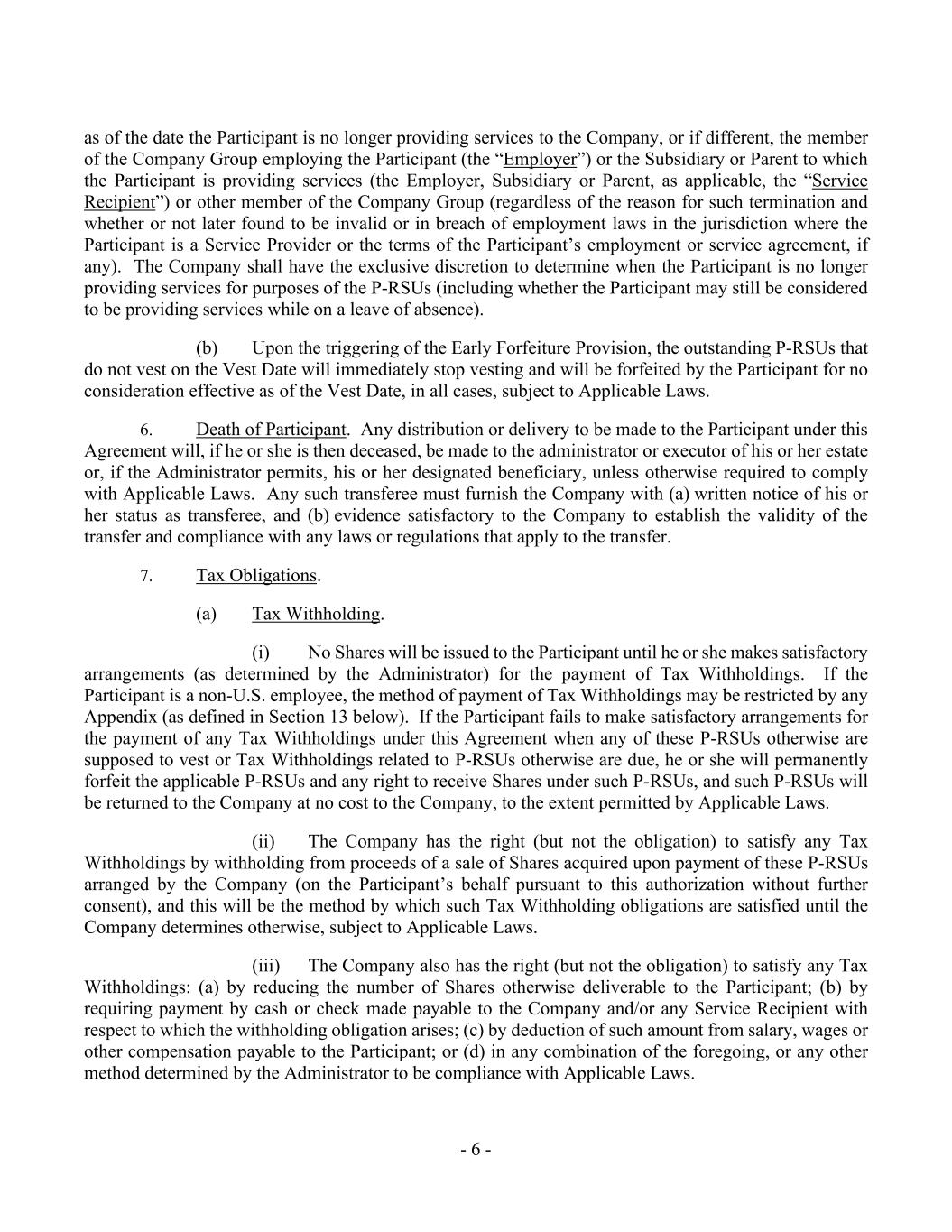 - 6 - as of the date the Participant is no longer providing services to the Company, or if different, the member of the Company Group employing the Participant (the “Employer”) or the Subsidiary or Parent to which the Participant is providing services (the Employer, Subsidiary or Parent, as applicable, the “Service Recipient”) or other member of the Company Group (regardless of the reason for such termination and whether or not later found to be invalid or in breach of employment laws in the jurisdiction where the Participant is a Service Provider or the terms of the Participant’s employment or service agreement, if any). The Company shall have the exclusive discretion to determine when the Participant is no longer providing services for purposes of the P-RSUs (including whether the Participant may still be considered to be providing services while on a leave of absence). (b) Upon the triggering of the Early Forfeiture Provision, the outstanding P-RSUs that do not vest on the Vest Date will immediately stop vesting and will be forfeited by the Participant for no consideration effective as of the Vest Date, in all cases, subject to Applicable Laws. 6. Death of Participant. Any distribution or delivery to be made to the Participant under this Agreement will, if he or she is then deceased, be made to the administrator or executor of his or her estate or, if the Administrator permits, his or her designated beneficiary, unless otherwise required to comply with Applicable Laws. Any such transferee must furnish the Company with (a) written notice of his or her status as transferee, and (b) evidence satisfactory to the Company to establish the validity of the transfer and compliance with any laws or regulations that apply to the transfer. 7. Tax Obligations. (a) Tax Withholding. (i) No Shares will be issued to the Participant until he or she makes satisfactory arrangements (as determined by the Administrator) for the payment of Tax Withholdings. If the Participant is a non-U.S. employee, the method of payment of Tax Withholdings may be restricted by any Appendix (as defined in Section 13 below). If the Participant fails to make satisfactory arrangements for the payment of any Tax Withholdings under this Agreement when any of these P-RSUs otherwise are supposed to vest or Tax Withholdings related to P-RSUs otherwise are due, he or she will permanently forfeit the applicable P-RSUs and any right to receive Shares under such P-RSUs, and such P-RSUs will be returned to the Company at no cost to the Company, to the extent permitted by Applicable Laws. (ii) The Company has the right (but not the obligation) to satisfy any Tax Withholdings by withholding from proceeds of a sale of Shares acquired upon payment of these P-RSUs arranged by the Company (on the Participant’s behalf pursuant to this authorization without further consent), and this will be the method by which such Tax Withholding obligations are satisfied until the Company determines otherwise, subject to Applicable Laws. (iii) The Company also has the right (but not the obligation) to satisfy any Tax Withholdings: (a) by reducing the number of Shares otherwise deliverable to the Participant; (b) by requiring payment by cash or check made payable to the Company and/or any Service Recipient with respect to which the withholding obligation arises; (c) by deduction of such amount from salary, wages or other compensation payable to the Participant; or (d) in any combination of the foregoing, or any other method determined by the Administrator to be compliance with Applicable Laws.