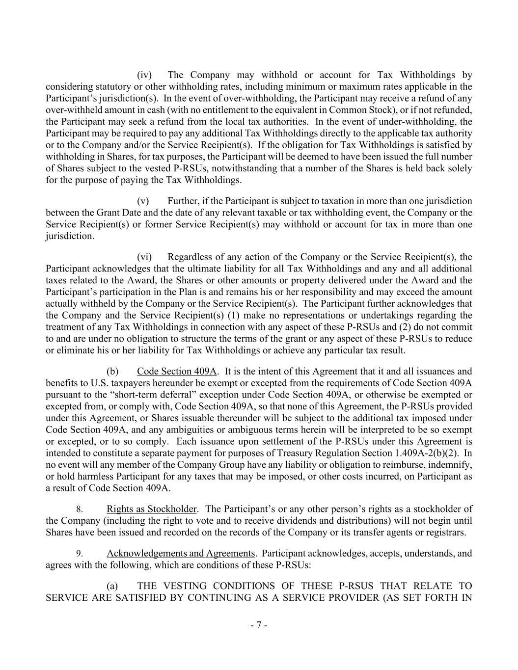 - 7 - (iv) The Company may withhold or account for Tax Withholdings by considering statutory or other withholding rates, including minimum or maximum rates applicable in the Participant’s jurisdiction(s). In the event of over-withholding, the Participant may receive a refund of any over-withheld amount in cash (with no entitlement to the equivalent in Common Stock), or if not refunded, the Participant may seek a refund from the local tax authorities. In the event of under-withholding, the Participant may be required to pay any additional Tax Withholdings directly to the applicable tax authority or to the Company and/or the Service Recipient(s). If the obligation for Tax Withholdings is satisfied by withholding in Shares, for tax purposes, the Participant will be deemed to have been issued the full number of Shares subject to the vested P-RSUs, notwithstanding that a number of the Shares is held back solely for the purpose of paying the Tax Withholdings. (v) Further, if the Participant is subject to taxation in more than one jurisdiction between the Grant Date and the date of any relevant taxable or tax withholding event, the Company or the Service Recipient(s) or former Service Recipient(s) may withhold or account for tax in more than one jurisdiction. (vi) Regardless of any action of the Company or the Service Recipient(s), the Participant acknowledges that the ultimate liability for all Tax Withholdings and any and all additional taxes related to the Award, the Shares or other amounts or property delivered under the Award and the Participant’s participation in the Plan is and remains his or her responsibility and may exceed the amount actually withheld by the Company or the Service Recipient(s). The Participant further acknowledges that the Company and the Service Recipient(s) (1) make no representations or undertakings regarding the treatment of any Tax Withholdings in connection with any aspect of these P-RSUs and (2) do not commit to and are under no obligation to structure the terms of the grant or any aspect of these P-RSUs to reduce or eliminate his or her liability for Tax Withholdings or achieve any particular tax result. (b) Code Section 409A. It is the intent of this Agreement that it and all issuances and benefits to U.S. taxpayers hereunder be exempt or excepted from the requirements of Code Section 409A pursuant to the “short-term deferral” exception under Code Section 409A, or otherwise be exempted or excepted from, or comply with, Code Section 409A, so that none of this Agreement, the P-RSUs provided under this Agreement, or Shares issuable thereunder will be subject to the additional tax imposed under Code Section 409A, and any ambiguities or ambiguous terms herein will be interpreted to be so exempt or excepted, or to so comply. Each issuance upon settlement of the P-RSUs under this Agreement is intended to constitute a separate payment for purposes of Treasury Regulation Section 1.409A-2(b)(2). In no event will any member of the Company Group have any liability or obligation to reimburse, indemnify, or hold harmless Participant for any taxes that may be imposed, or other costs incurred, on Participant as a result of Code Section 409A. 8. Rights as Stockholder. The Participant’s or any other person’s rights as a stockholder of the Company (including the right to vote and to receive dividends and distributions) will not begin until Shares have been issued and recorded on the records of the Company or its transfer agents or registrars. 9. Acknowledgements and Agreements. Participant acknowledges, accepts, understands, and agrees with the following, which are conditions of these P-RSUs: (a) THE VESTING CONDITIONS OF THESE P-RSUS THAT RELATE TO SERVICE ARE SATISFIED BY CONTINUING AS A SERVICE PROVIDER (AS SET FORTH IN
