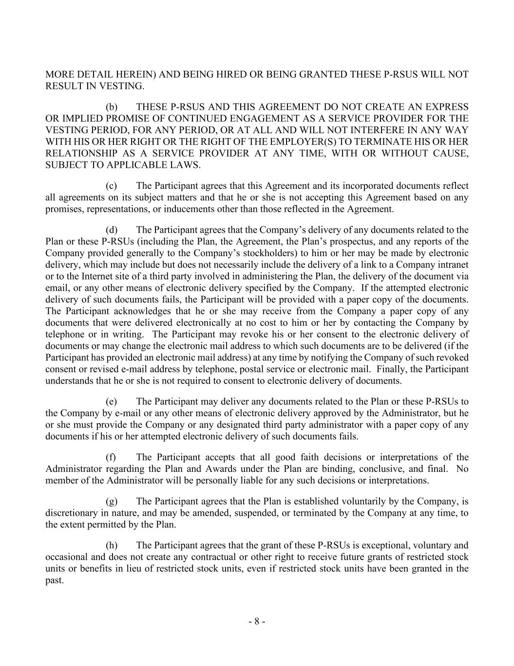 - 8 - MORE DETAIL HEREIN) AND BEING HIRED OR BEING GRANTED THESE P-RSUS WILL NOT RESULT IN VESTING. (b) THESE P-RSUS AND THIS AGREEMENT DO NOT CREATE AN EXPRESS OR IMPLIED PROMISE OF CONTINUED ENGAGEMENT AS A SERVICE PROVIDER FOR THE VESTING PERIOD, FOR ANY PERIOD, OR AT ALL AND WILL NOT INTERFERE IN ANY WAY WITH HIS OR HER RIGHT OR THE RIGHT OF THE EMPLOYER(S) TO TERMINATE HIS OR HER RELATIONSHIP AS A SERVICE PROVIDER AT ANY TIME, WITH OR WITHOUT CAUSE, SUBJECT TO APPLICABLE LAWS. (c) The Participant agrees that this Agreement and its incorporated documents reflect all agreements on its subject matters and that he or she is not accepting this Agreement based on any promises, representations, or inducements other than those reflected in the Agreement. (d) The Participant agrees that the Company’s delivery of any documents related to the Plan or these P-RSUs (including the Plan, the Agreement, the Plan’s prospectus, and any reports of the Company provided generally to the Company’s stockholders) to him or her may be made by electronic delivery, which may include but does not necessarily include the delivery of a link to a Company intranet or to the Internet site of a third party involved in administering the Plan, the delivery of the document via email, or any other means of electronic delivery specified by the Company. If the attempted electronic delivery of such documents fails, the Participant will be provided with a paper copy of the documents. The Participant acknowledges that he or she may receive from the Company a paper copy of any documents that were delivered electronically at no cost to him or her by contacting the Company by telephone or in writing. The Participant may revoke his or her consent to the electronic delivery of documents or may change the electronic mail address to which such documents are to be delivered (if the Participant has provided an electronic mail address) at any time by notifying the Company of such revoked consent or revised e-mail address by telephone, postal service or electronic mail. Finally, the Participant understands that he or she is not required to consent to electronic delivery of documents. (e) The Participant may deliver any documents related to the Plan or these P-RSUs to the Company by e-mail or any other means of electronic delivery approved by the Administrator, but he or she must provide the Company or any designated third party administrator with a paper copy of any documents if his or her attempted electronic delivery of such documents fails. (f) The Participant accepts that all good faith decisions or interpretations of the Administrator regarding the Plan and Awards under the Plan are binding, conclusive, and final. No member of the Administrator will be personally liable for any such decisions or interpretations. (g) The Participant agrees that the Plan is established voluntarily by the Company, is discretionary in nature, and may be amended, suspended, or terminated by the Company at any time, to the extent permitted by the Plan. (h) The Participant agrees that the grant of these P-RSUs is exceptional, voluntary and occasional and does not create any contractual or other right to receive future grants of restricted stock units or benefits in lieu of restricted stock units, even if restricted stock units have been granted in the past.