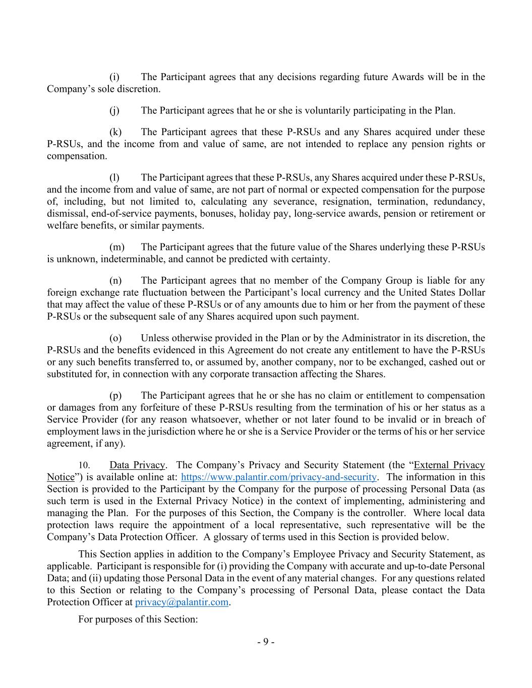 - 9 - (i) The Participant agrees that any decisions regarding future Awards will be in the Company’s sole discretion. (j) The Participant agrees that he or she is voluntarily participating in the Plan. (k) The Participant agrees that these P-RSUs and any Shares acquired under these P-RSUs, and the income from and value of same, are not intended to replace any pension rights or compensation. (l) The Participant agrees that these P-RSUs, any Shares acquired under these P-RSUs, and the income from and value of same, are not part of normal or expected compensation for the purpose of, including, but not limited to, calculating any severance, resignation, termination, redundancy, dismissal, end-of-service payments, bonuses, holiday pay, long-service awards, pension or retirement or welfare benefits, or similar payments. (m) The Participant agrees that the future value of the Shares underlying these P-RSUs is unknown, indeterminable, and cannot be predicted with certainty. (n) The Participant agrees that no member of the Company Group is liable for any foreign exchange rate fluctuation between the Participant’s local currency and the United States Dollar that may affect the value of these P-RSUs or of any amounts due to him or her from the payment of these P-RSUs or the subsequent sale of any Shares acquired upon such payment. (o) Unless otherwise provided in the Plan or by the Administrator in its discretion, the P-RSUs and the benefits evidenced in this Agreement do not create any entitlement to have the P-RSUs or any such benefits transferred to, or assumed by, another company, nor to be exchanged, cashed out or substituted for, in connection with any corporate transaction affecting the Shares. (p) The Participant agrees that he or she has no claim or entitlement to compensation or damages from any forfeiture of these P-RSUs resulting from the termination of his or her status as a Service Provider (for any reason whatsoever, whether or not later found to be invalid or in breach of employment laws in the jurisdiction where he or she is a Service Provider or the terms of his or her service agreement, if any). 10. Data Privacy. The Company’s Privacy and Security Statement (the “External Privacy Notice”) is available online at: https://www.palantir.com/privacy-and-security. The information in this Section is provided to the Participant by the Company for the purpose of processing Personal Data (as such term is used in the External Privacy Notice) in the context of implementing, administering and managing the Plan. For the purposes of this Section, the Company is the controller. Where local data protection laws require the appointment of a local representative, such representative will be the Company’s Data Protection Officer. A glossary of terms used in this Section is provided below. This Section applies in addition to the Company’s Employee Privacy and Security Statement, as applicable. Participant is responsible for (i) providing the Company with accurate and up-to-date Personal Data; and (ii) updating those Personal Data in the event of any material changes. For any questions related to this Section or relating to the Company’s processing of Personal Data, please contact the Data Protection Officer at [email protected]. For purposes of this Section: