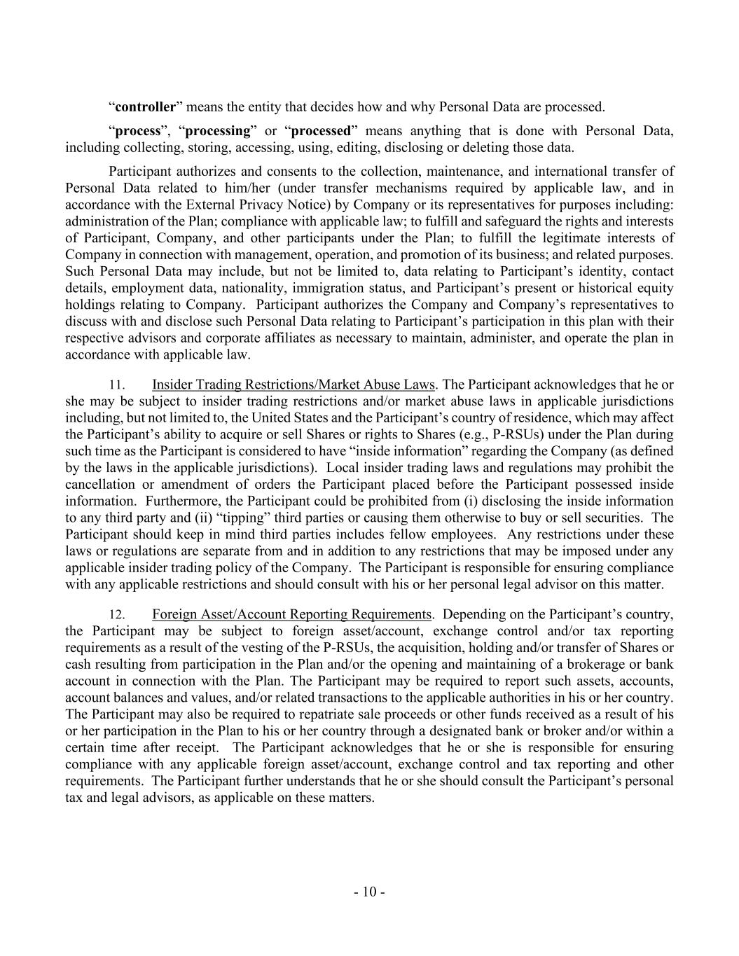 - 10 - “controller” means the entity that decides how and why Personal Data are processed. “process”, “processing” or “processed” means anything that is done with Personal Data, including collecting, storing, accessing, using, editing, disclosing or deleting those data. Participant authorizes and consents to the collection, maintenance, and international transfer of Personal Data related to him/her (under transfer mechanisms required by applicable law, and in accordance with the External Privacy Notice) by Company or its representatives for purposes including: administration of the Plan; compliance with applicable law; to fulfill and safeguard the rights and interests of Participant, Company, and other participants under the Plan; to fulfill the legitimate interests of Company in connection with management, operation, and promotion of its business; and related purposes. Such Personal Data may include, but not be limited to, data relating to Participant’s identity, contact details, employment data, nationality, immigration status, and Participant’s present or historical equity holdings relating to Company. Participant authorizes the Company and Company’s representatives to discuss with and disclose such Personal Data relating to Participant’s participation in this plan with their respective advisors and corporate affiliates as necessary to maintain, administer, and operate the plan in accordance with applicable law. 11. Insider Trading Restrictions/Market Abuse Laws. The Participant acknowledges that he or she may be subject to insider trading restrictions and/or market abuse laws in applicable jurisdictions including, but not limited to, the United States and the Participant’s country of residence, which may affect the Participant’s ability to acquire or sell Shares or rights to Shares (e.g., P-RSUs) under the Plan during such time as the Participant is considered to have “inside information” regarding the Company (as defined by the laws in the applicable jurisdictions). Local insider trading laws and regulations may prohibit the cancellation or amendment of orders the Participant placed before the Participant possessed inside information. Furthermore, the Participant could be prohibited from (i) disclosing the inside information to any third party and (ii) “tipping” third parties or causing them otherwise to buy or sell securities. The Participant should keep in mind third parties includes fellow employees. Any restrictions under these laws or regulations are separate from and in addition to any restrictions that may be imposed under any applicable insider trading policy of the Company. The Participant is responsible for ensuring compliance with any applicable restrictions and should consult with his or her personal legal advisor on this matter. 12. Foreign Asset/Account Reporting Requirements. Depending on the Participant’s country, the Participant may be subject to foreign asset/account, exchange control and/or tax reporting requirements as a result of the vesting of the P-RSUs, the acquisition, holding and/or transfer of Shares or cash resulting from participation in the Plan and/or the opening and maintaining of a brokerage or bank account in connection with the Plan. The Participant may be required to report such assets, accounts, account balances and values, and/or related transactions to the applicable authorities in his or her country. The Participant may also be required to repatriate sale proceeds or other funds received as a result of his or her participation in the Plan to his or her country through a designated bank or broker and/or within a certain time after receipt. The Participant acknowledges that he or she is responsible for ensuring compliance with any applicable foreign asset/account, exchange control and tax reporting and other requirements. The Participant further understands that he or she should consult the Participant’s personal tax and legal advisors, as applicable on these matters.