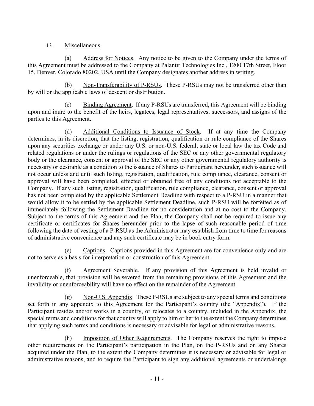 - 11 - 13. Miscellaneous. (a) Address for Notices. Any notice to be given to the Company under the terms of this Agreement must be addressed to the Company at Palantir Technologies Inc., 1200 17th Street, Floor 15, Denver, Colorado 80202, USA until the Company designates another address in writing. (b) Non-Transferability of P-RSUs. These P-RSUs may not be transferred other than by will or the applicable laws of descent or distribution. (c) Binding Agreement. If any P-RSUs are transferred, this Agreement will be binding upon and inure to the benefit of the heirs, legatees, legal representatives, successors, and assigns of the parties to this Agreement. (d) Additional Conditions to Issuance of Stock. If at any time the Company determines, in its discretion, that the listing, registration, qualification or rule compliance of the Shares upon any securities exchange or under any U.S. or non-U.S. federal, state or local law the tax Code and related regulations or under the rulings or regulations of the SEC or any other governmental regulatory body or the clearance, consent or approval of the SEC or any other governmental regulatory authority is necessary or desirable as a condition to the issuance of Shares to Participant hereunder, such issuance will not occur unless and until such listing, registration, qualification, rule compliance, clearance, consent or approval will have been completed, effected or obtained free of any conditions not acceptable to the Company. If any such listing, registration, qualification, rule compliance, clearance, consent or approval has not been completed by the applicable Settlement Deadline with respect to a P-RSU in a manner that would allow it to be settled by the applicable Settlement Deadline, such P-RSU will be forfeited as of immediately following the Settlement Deadline for no consideration and at no cost to the Company. Subject to the terms of this Agreement and the Plan, the Company shall not be required to issue any certificate or certificates for Shares hereunder prior to the lapse of such reasonable period of time following the date of vesting of a P-RSU as the Administrator may establish from time to time for reasons of administrative convenience and any such certificate may be in book entry form. (e) Captions. Captions provided in this Agreement are for convenience only and are not to serve as a basis for interpretation or construction of this Agreement. (f) Agreement Severable. If any provision of this Agreement is held invalid or unenforceable, that provision will be severed from the remaining provisions of this Agreement and the invalidity or unenforceability will have no effect on the remainder of the Agreement. (g) Non-U.S. Appendix. These P-RSUs are subject to any special terms and conditions set forth in any appendix to this Agreement for the Participant’s country (the “Appendix”). If the Participant resides and/or works in a country, or relocates to a country, included in the Appendix, the special terms and conditions for that country will apply to him or her to the extent the Company determines that applying such terms and conditions is necessary or advisable for legal or administrative reasons. (h) Imposition of Other Requirements. The Company reserves the right to impose other requirements on the Participant’s participation in the Plan, on the P-RSUs and on any Shares acquired under the Plan, to the extent the Company determines it is necessary or advisable for legal or administrative reasons, and to require the Participant to sign any additional agreements or undertakings