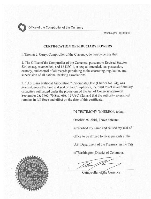 In accordance with Section 321(b) of the Trust Indenture Act of 1939, the undersigned, U.S. BANK NATIONAL ASSOCIATION hereby consents that reports of examination of the undersigned by Federal, State, Territorial or District authorities may be furnished by such authorities to the Securities and Exchange Commission upon its request therefor.
