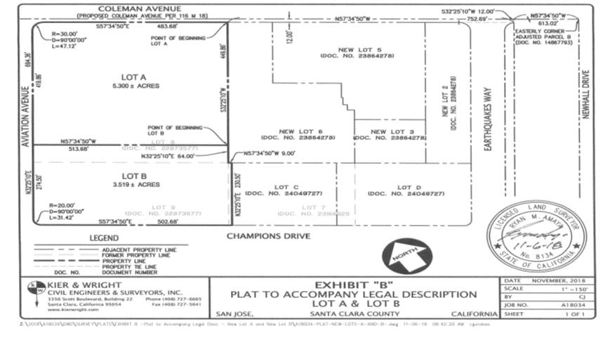 B.Pursuant to the Lease, Tenant is currently leasing from Landlord a total of 380,951 RSF, as further set forth in Exhibit A to the Lease, consisting of (i) the entirety of the 194,790 RSF of that certain six (6)-story building ("Building 3") to be located at 1173 Coleman Avenue, San Jose, California 95110, (ii) the entirety of the 163,272 RSF of that certain five (5)-story building ("Building 4") to be located at 1167 Coleman Avenue, San Jose, California 95110 and (iii) the entirety of the 22,889 RSF of that certain three (3)-story amenities building ("Building A2") to be located at 1161 Coleman Avenue, San Jose, California 95110. Building 3, Building 4, and Building A2 are collectively referred to herein as the "Buildings."