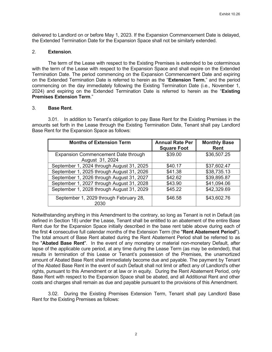 2 delivered to Landlord on or before May 1, 2023. If the Expansion Commencement Date is delayed, the Extended Termination Date for the Expansion Space shall not be similarly extended. 2. Extension. The term of the Lease with respect to the Existing Premises is extended to be coterminous with the term of the Lease with respect to the Expansion Space and shall expire on the Extended Termination Date. The period commencing on the Expansion Commencement Date and expiring on the Extended Termination Date is referred to herein as the “Extension Term,” and the period commencing on the day immediately following the Existing Termination Date (i.e., November 1, 2024) and expiring on the Extended Termination Date is referred to herein as the “Existing Premises Extension Term.” 3. Base Rent. 3.01. In addition to Tenant’s obligation to pay Base Rent for the Existing Premises in the amounts set forth in the Lease through the Existing Termination Date, Tenant shall pay Landlord Base Rent for the Expansion Space as follows: Months of Extension Term Annual Rate Per Square Foot Monthly Base Rent Expansion Commencement Date through August 31, 2024 $39.00 $36,507.25 September 1, 2024 through August 31, 2025 $40.17 $37,602.47 September 1, 2025 through August 31, 2026 $41.38 $38,735.13 September 1, 2026 through August 31, 2027 $42.62 $39,895.87 September 1, 2027 through August 31, 2028 $43.90 $41,094.06 September 1, 2028 through August 31, 2029 $45.22 $42,329.69 September 1, 2029 through February 28, 2030 $46.58 $43,602.76 Notwithstanding anything in this Amendment to the contrary, so long as Tenant is not in Default (as defined in Section 18) under the Lease, Tenant shall be entitled to an abatement of the entire Base Rent due for the Expansion Space initially described in the base rent table above during each of the first 4 consecutive full calendar months of the Extension Term (the "Rent Abatement Period"). The total amount of Base Rent abated during the Rent Abatement Period shall be referred to as the "Abated Base Rent". In the event of any monetary or material non-monetary Default, after lapse of the applicable cure period, at any time during the Lease Term (as may be extended), that results in termination of this Lease or Tenant’s possession of the Premises, the unamortized amount of Abated Base Rent shall immediately become due and payable. The payment by Tenant of the Abated Base Rent in the event of such Default shall not limit or affect any of Landlord's other rights, pursuant to this Amendment or at law or in equity. During the Rent Abatement Period, only Base Rent with respect to the Expansion Space shall be abated, and all Additional Rent and other costs and charges shall remain as due and payable pursuant to the provisions of this Amendment. 3.02. During the Existing Premises Extension Term, Tenant shall pay Landlord Base Rent for the Existing Premises as follows: Exhibit 10.26