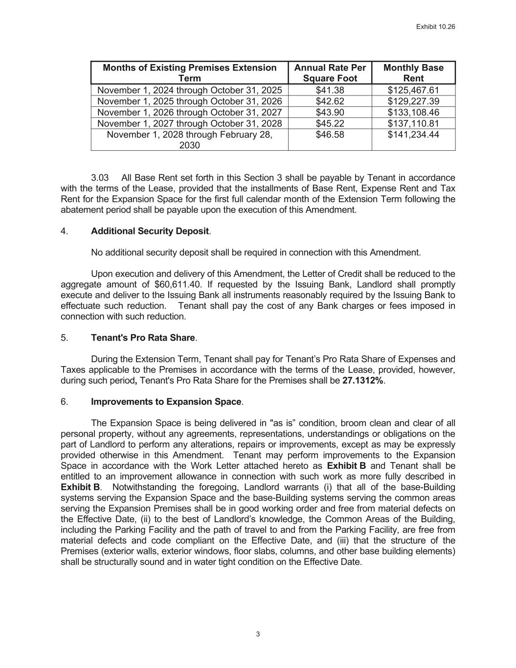 3 Months of Existing Premises Extension Term Annual Rate Per Square Foot Monthly Base Rent November 1, 2024 through October 31, 2025 $41.38 $125,467.61 November 1, 2025 through October 31, 2026 $42.62 $129,227.39 November 1, 2026 through October 31, 2027 $43.90 $133,108.46 November 1, 2027 through October 31, 2028 $45.22 $137,110.81 November 1, 2028 through February 28, 2030 $46.58 $141,234.44 3.03 All Base Rent set forth in this Section 3 shall be payable by Tenant in accordance with the terms of the Lease, provided that the installments of Base Rent, Expense Rent and Tax Rent for the Expansion Space for the first full calendar month of the Extension Term following the abatement period shall be payable upon the execution of this Amendment. 4. Additional Security Deposit. No additional security deposit shall be required in connection with this Amendment. Upon execution and delivery of this Amendment, the Letter of Credit shall be reduced to the aggregate amount of $60,611.40. If requested by the Issuing Bank, Landlord shall promptly execute and deliver to the Issuing Bank all instruments reasonably required by the Issuing Bank to effectuate such reduction. Tenant shall pay the cost of any Bank charges or fees imposed in connection with such reduction. 5. Tenant's Pro Rata Share. During the Extension Term, Tenant shall pay for Tenant’s Pro Rata Share of Expenses and Taxes applicable to the Premises in accordance with the terms of the Lease, provided, however, during such period, Tenant's Pro Rata Share for the Premises shall be 27.1312%. 6. Improvements to Expansion Space. The Expansion Space is being delivered in "as is” condition, broom clean and clear of all personal property, without any agreements, representations, understandings or obligations on the part of Landlord to perform any alterations, repairs or improvements, except as may be expressly provided otherwise in this Amendment. Tenant may perform improvements to the Expansion Space in accordance with the Work Letter attached hereto as Exhibit B and Tenant shall be entitled to an improvement allowance in connection with such work as more fully described in Exhibit B. Notwithstanding the foregoing, Landlord warrants (i) that all of the base-Building systems serving the Expansion Space and the base-Building systems serving the common areas serving the Expansion Premises shall be in good working order and free from material defects on the Effective Date, (ii) to the best of Landlord’s knowledge, the Common Areas of the Building, including the Parking Facility and the path of travel to and from the Parking Facility, are free from material defects and code compliant on the Effective Date, and (iii) that the structure of the Premises (exterior walls, exterior windows, floor slabs, columns, and other base building elements) shall be structurally sound and in water tight condition on the Effective Date. Exhibit 10.26