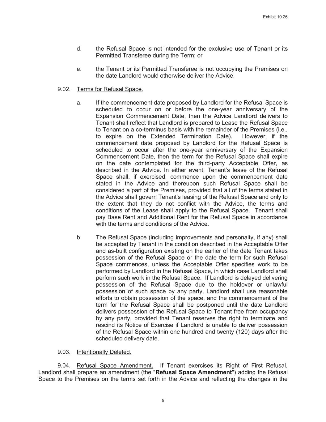 5 d. the Refusal Space is not intended for the exclusive use of Tenant or its Permitted Transferee during the Term; or e. the Tenant or its Permitted Transferee is not occupying the Premises on the date Landlord would otherwise deliver the Advice. 9.02. Terms for Refusal Space. a. If the commencement date proposed by Landlord for the Refusal Space is scheduled to occur on or before the one-year anniversary of the Expansion Commencement Date, then the Advice Landlord delivers to Tenant shall reflect that Landlord is prepared to Lease the Refusal Space to Tenant on a co-terminus basis with the remainder of the Premises (i.e., to expire on the Extended Termination Date). However, if the commencement date proposed by Landlord for the Refusal Space is scheduled to occur after the one-year anniversary of the Expansion Commencement Date, then the term for the Refusal Space shall expire on the date contemplated for the third-party Acceptable Offer, as described in the Advice. In either event, Tenant’s lease of the Refusal Space shall, if exercised, commence upon the commencement date stated in the Advice and thereupon such Refusal Space shall be considered a part of the Premises, provided that all of the terms stated in the Advice shall govern Tenant's leasing of the Refusal Space and only to the extent that they do not conflict with the Advice, the terms and conditions of the Lease shall apply to the Refusal Space. Tenant shall pay Base Rent and Additional Rent for the Refusal Space in accordance with the terms and conditions of the Advice. b. The Refusal Space (including improvements and personalty, if any) shall be accepted by Tenant in the condition described in the Acceptable Offer and as-built configuration existing on the earlier of the date Tenant takes possession of the Refusal Space or the date the term for such Refusal Space commences, unless the Acceptable Offer specifies work to be performed by Landlord in the Refusal Space, in which case Landlord shall perform such work in the Refusal Space. If Landlord is delayed delivering possession of the Refusal Space due to the holdover or unlawful possession of such space by any party, Landlord shall use reasonable efforts to obtain possession of the space, and the commencement of the term for the Refusal Space shall be postponed until the date Landlord delivers possession of the Refusal Space to Tenant free from occupancy by any party, provided that Tenant reserves the right to terminate and rescind its Notice of Exercise if Landlord is unable to deliver possession of the Refusal Space within one hundred and twenty (120) days after the scheduled delivery date. 9.03. Intentionally Deleted. 9.04. Refusal Space Amendment. If Tenant exercises its Right of First Refusal, Landlord shall prepare an amendment (the "Refusal Space Amendment") adding the Refusal Space to the Premises on the terms set forth in the Advice and reflecting the changes in the Exhibit 10.26