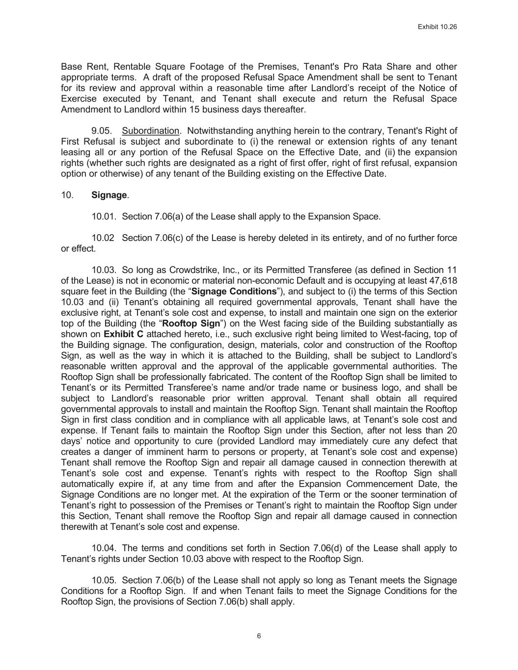 6 Base Rent, Rentable Square Footage of the Premises, Tenant's Pro Rata Share and other appropriate terms. A draft of the proposed Refusal Space Amendment shall be sent to Tenant for its review and approval within a reasonable time after Landlord’s receipt of the Notice of Exercise executed by Tenant, and Tenant shall execute and return the Refusal Space Amendment to Landlord within 15 business days thereafter. 9.05. Subordination. Notwithstanding anything herein to the contrary, Tenant's Right of First Refusal is subject and subordinate to (i) the renewal or extension rights of any tenant leasing all or any portion of the Refusal Space on the Effective Date, and (ii) the expansion rights (whether such rights are designated as a right of first offer, right of first refusal, expansion option or otherwise) of any tenant of the Building existing on the Effective Date. 10. Signage. 10.01. Section 7.06(a) of the Lease shall apply to the Expansion Space. 10.02 Section 7.06(c) of the Lease is hereby deleted in its entirety, and of no further force or effect. 10.03. So long as Crowdstrike, Inc., or its Permitted Transferee (as defined in Section 11 of the Lease) is not in economic or material non-economic Default and is occupying at least 47,618 square feet in the Building (the “Signage Conditions”), and subject to (i) the terms of this Section 10.03 and (ii) Tenant’s obtaining all required governmental approvals, Tenant shall have the exclusive right, at Tenant’s sole cost and expense, to install and maintain one sign on the exterior top of the Building (the “Rooftop Sign”) on the West facing side of the Building substantially as shown on Exhibit C attached hereto, i.e., such exclusive right being limited to West-facing, top of the Building signage. The configuration, design, materials, color and construction of the Rooftop Sign, as well as the way in which it is attached to the Building, shall be subject to Landlord’s reasonable written approval and the approval of the applicable governmental authorities. The Rooftop Sign shall be professionally fabricated. The content of the Rooftop Sign shall be limited to Tenant’s or its Permitted Transferee’s name and/or trade name or business logo, and shall be subject to Landlord’s reasonable prior written approval. Tenant shall obtain all required governmental approvals to install and maintain the Rooftop Sign. Tenant shall maintain the Rooftop Sign in first class condition and in compliance with all applicable laws, at Tenant’s sole cost and expense. If Tenant fails to maintain the Rooftop Sign under this Section, after not less than 20 days’ notice and opportunity to cure (provided Landlord may immediately cure any defect that creates a danger of imminent harm to persons or property, at Tenant’s sole cost and expense) Tenant shall remove the Rooftop Sign and repair all damage caused in connection therewith at Tenant’s sole cost and expense. Tenant’s rights with respect to the Rooftop Sign shall automatically expire if, at any time from and after the Expansion Commencement Date, the Signage Conditions are no longer met. At the expiration of the Term or the sooner termination of Tenant’s right to possession of the Premises or Tenant’s right to maintain the Rooftop Sign under this Section, Tenant shall remove the Rooftop Sign and repair all damage caused in connection therewith at Tenant’s sole cost and expense. 10.04. The terms and conditions set forth in Section 7.06(d) of the Lease shall apply to Tenant’s rights under Section 10.03 above with respect to the Rooftop Sign. 10.05. Section 7.06(b) of the Lease shall not apply so long as Tenant meets the Signage Conditions for a Rooftop Sign. If and when Tenant fails to meet the Signage Conditions for the Rooftop Sign, the provisions of Section 7.06(b) shall apply. Exhibit 10.26