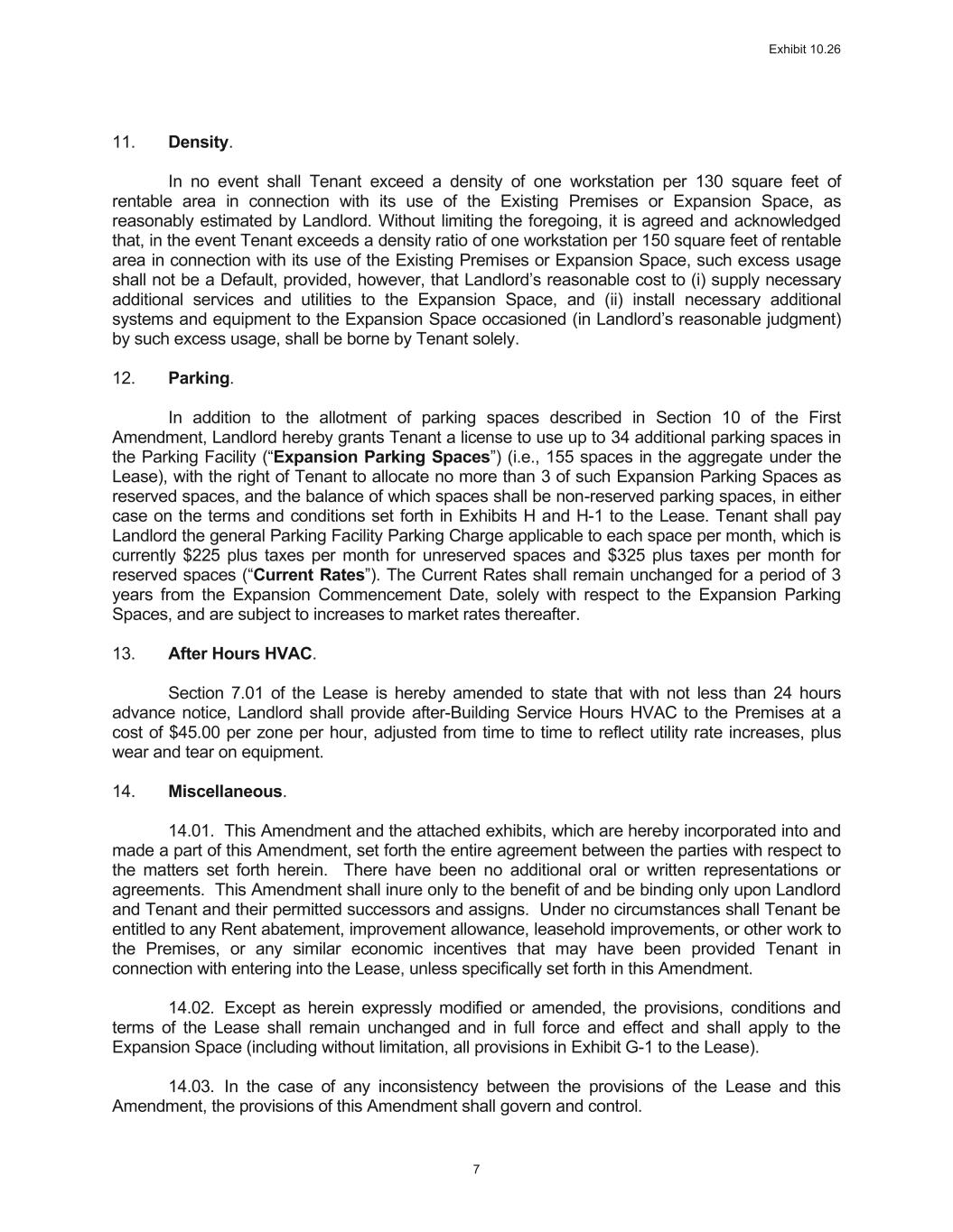 7 11. Density. In no event shall Tenant exceed a density of one workstation per 130 square feet of rentable area in connection with its use of the Existing Premises or Expansion Space, as reasonably estimated by Landlord. Without limiting the foregoing, it is agreed and acknowledged that, in the event Tenant exceeds a density ratio of one workstation per 150 square feet of rentable area in connection with its use of the Existing Premises or Expansion Space, such excess usage shall not be a Default, provided, however, that Landlord’s reasonable cost to (i) supply necessary additional services and utilities to the Expansion Space, and (ii) install necessary additional systems and equipment to the Expansion Space occasioned (in Landlord’s reasonable judgment) by such excess usage, shall be borne by Tenant solely. 12. Parking. In addition to the allotment of parking spaces described in Section 10 of the First Amendment, Landlord hereby grants Tenant a license to use up to 34 additional parking spaces in the Parking Facility (“Expansion Parking Spaces”) (i.e., 155 spaces in the aggregate under the Lease), with the right of Tenant to allocate no more than 3 of such Expansion Parking Spaces as reserved spaces, and the balance of which spaces shall be non-reserved parking spaces, in either case on the terms and conditions set forth in Exhibits H and H-1 to the Lease. Tenant shall pay Landlord the general Parking Facility Parking Charge applicable to each space per month, which is currently $225 plus taxes per month for unreserved spaces and $325 plus taxes per month for reserved spaces (“Current Rates”). The Current Rates shall remain unchanged for a period of 3 years from the Expansion Commencement Date, solely with respect to the Expansion Parking Spaces, and are subject to increases to market rates thereafter. 13. After Hours HVAC. Section 7.01 of the Lease is hereby amended to state that with not less than 24 hours advance notice, Landlord shall provide after-Building Service Hours HVAC to the Premises at a cost of $45.00 per zone per hour, adjusted from time to time to reflect utility rate increases, plus wear and tear on equipment. 14. Miscellaneous. 14.01. This Amendment and the attached exhibits, which are hereby incorporated into and made a part of this Amendment, set forth the entire agreement between the parties with respect to the matters set forth herein. There have been no additional oral or written representations or agreements. This Amendment shall inure only to the benefit of and be binding only upon Landlord and Tenant and their permitted successors and assigns. Under no circumstances shall Tenant be entitled to any Rent abatement, improvement allowance, leasehold improvements, or other work to the Premises, or any similar economic incentives that may have been provided Tenant in connection with entering into the Lease, unless specifically set forth in this Amendment. 14.02. Except as herein expressly modified or amended, the provisions, conditions and terms of the Lease shall remain unchanged and in full force and effect and shall apply to the Expansion Space (including without limitation, all provisions in Exhibit G-1 to the Lease). 14.03. In the case of any inconsistency between the provisions of the Lease and this Amendment, the provisions of this Amendment shall govern and control. Exhibit 10.26