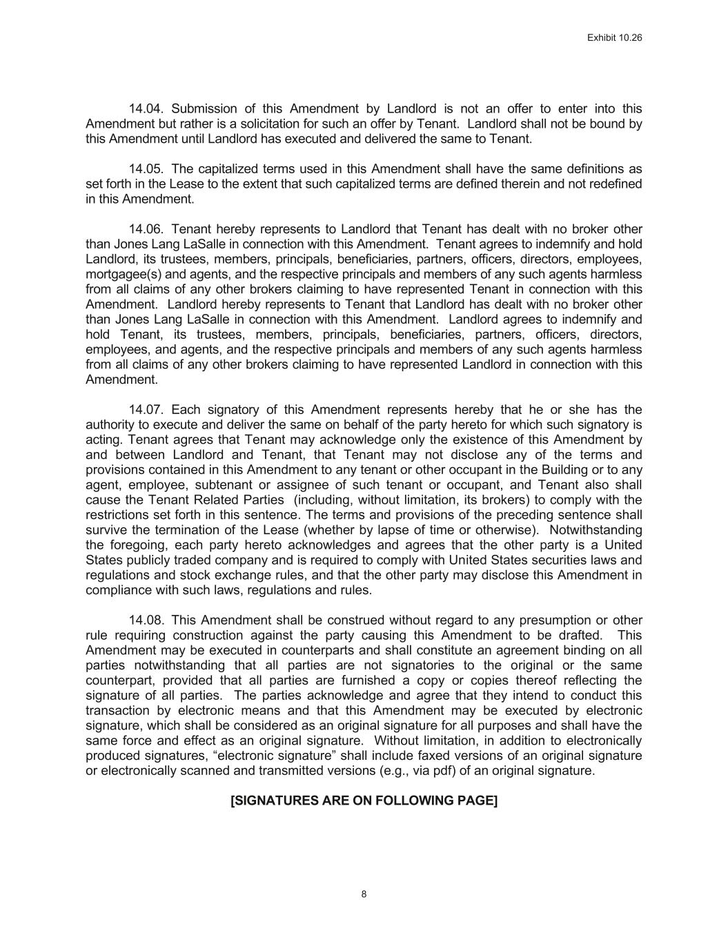 8 14.04. Submission of this Amendment by Landlord is not an offer to enter into this Amendment but rather is a solicitation for such an offer by Tenant. Landlord shall not be bound by this Amendment until Landlord has executed and delivered the same to Tenant. 14.05. The capitalized terms used in this Amendment shall have the same definitions as set forth in the Lease to the extent that such capitalized terms are defined therein and not redefined in this Amendment. 14.06. Tenant hereby represents to Landlord that Tenant has dealt with no broker other than Jones Lang LaSalle in connection with this Amendment. Tenant agrees to indemnify and hold Landlord, its trustees, members, principals, beneficiaries, partners, officers, directors, employees, mortgagee(s) and agents, and the respective principals and members of any such agents harmless from all claims of any other brokers claiming to have represented Tenant in connection with this Amendment. Landlord hereby represents to Tenant that Landlord has dealt with no broker other than Jones Lang LaSalle in connection with this Amendment. Landlord agrees to indemnify and hold Tenant, its trustees, members, principals, beneficiaries, partners, officers, directors, employees, and agents, and the respective principals and members of any such agents harmless from all claims of any other brokers claiming to have represented Landlord in connection with this Amendment. 14.07. Each signatory of this Amendment represents hereby that he or she has the authority to execute and deliver the same on behalf of the party hereto for which such signatory is acting. Tenant agrees that Tenant may acknowledge only the existence of this Amendment by and between Landlord and Tenant, that Tenant may not disclose any of the terms and provisions contained in this Amendment to any tenant or other occupant in the Building or to any agent, employee, subtenant or assignee of such tenant or occupant, and Tenant also shall cause the Tenant Related Parties (including, without limitation, its brokers) to comply with the restrictions set forth in this sentence. The terms and provisions of the preceding sentence shall survive the termination of the Lease (whether by lapse of time or otherwise). Notwithstanding the foregoing, each party hereto acknowledges and agrees that the other party is a United States publicly traded company and is required to comply with United States securities laws and regulations and stock exchange rules, and that the other party may disclose this Amendment in compliance with such laws, regulations and rules. 14.08. This Amendment shall be construed without regard to any presumption or other rule requiring construction against the party causing this Amendment to be drafted. This Amendment may be executed in counterparts and shall constitute an agreement binding on all parties notwithstanding that all parties are not signatories to the original or the same counterpart, provided that all parties are furnished a copy or copies thereof reflecting the signature of all parties. The parties acknowledge and agree that they intend to conduct this transaction by electronic means and that this Amendment may be executed by electronic signature, which shall be considered as an original signature for all purposes and shall have the same force and effect as an original signature. Without limitation, in addition to electronically produced signatures, “electronic signature” shall include faxed versions of an original signature or electronically scanned and transmitted versions (e.g., via pdf) of an original signature. [SIGNATURES ARE ON FOLLOWING PAGE] Exhibit 10.26