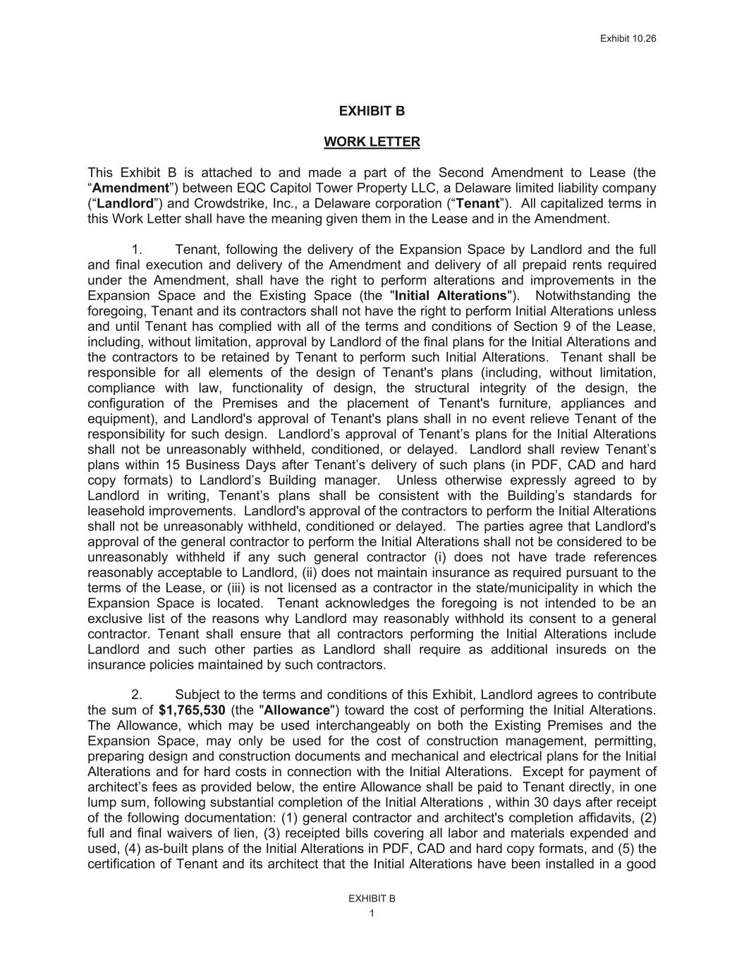 EXHIBIT B 1 EXHIBIT B WORK LETTER This Exhibit B is attached to and made a part of the Second Amendment to Lease (the “Amendment”) between EQC Capitol Tower Property LLC, a Delaware limited liability company (“Landlord”) and Crowdstrike, Inc., a Delaware corporation (“Tenant”). All capitalized terms in this Work Letter shall have the meaning given them in the Lease and in the Amendment. 1. Tenant, following the delivery of the Expansion Space by Landlord and the full and final execution and delivery of the Amendment and delivery of all prepaid rents required under the Amendment, shall have the right to perform alterations and improvements in the Expansion Space and the Existing Space (the "Initial Alterations"). Notwithstanding the foregoing, Tenant and its contractors shall not have the right to perform Initial Alterations unless and until Tenant has complied with all of the terms and conditions of Section 9 of the Lease, including, without limitation, approval by Landlord of the final plans for the Initial Alterations and the contractors to be retained by Tenant to perform such Initial Alterations. Tenant shall be responsible for all elements of the design of Tenant's plans (including, without limitation, compliance with law, functionality of design, the structural integrity of the design, the configuration of the Premises and the placement of Tenant's furniture, appliances and equipment), and Landlord's approval of Tenant's plans shall in no event relieve Tenant of the responsibility for such design. Landlord’s approval of Tenant’s plans for the Initial Alterations shall not be unreasonably withheld, conditioned, or delayed. Landlord shall review Tenant’s plans within 15 Business Days after Tenant’s delivery of such plans (in PDF, CAD and hard copy formats) to Landlord’s Building manager. Unless otherwise expressly agreed to by Landlord in writing, Tenant’s plans shall be consistent with the Building’s standards for leasehold improvements. Landlord's approval of the contractors to perform the Initial Alterations shall not be unreasonably withheld, conditioned or delayed. The parties agree that Landlord's approval of the general contractor to perform the Initial Alterations shall not be considered to be unreasonably withheld if any such general contractor (i) does not have trade references reasonably acceptable to Landlord, (ii) does not maintain insurance as required pursuant to the terms of the Lease, or (iii) is not licensed as a contractor in the state/municipality in which the Expansion Space is located. Tenant acknowledges the foregoing is not intended to be an exclusive list of the reasons why Landlord may reasonably withhold its consent to a general contractor. Tenant shall ensure that all contractors performing the Initial Alterations include Landlord and such other parties as Landlord shall require as additional insureds on the insurance policies maintained by such contractors. 2. Subject to the terms and conditions of this Exhibit, Landlord agrees to contribute the sum of $1,765,530 (the "Allowance") toward the cost of performing the Initial Alterations. The Allowance, which may be used interchangeably on both the Existing Premises and the Expansion Space, may only be used for the cost of construction management, permitting, preparing design and construction documents and mechanical and electrical plans for the Initial Alterations and for hard costs in connection with the Initial Alterations. Except for payment of architect’s fees as provided below, the entire Allowance shall be paid to Tenant directly, in one lump sum, following substantial completion of the Initial Alterations , within 30 days after receipt of the following documentation: (1) general contractor and architect's completion affidavits, (2) full and final waivers of lien, (3) receipted bills covering all labor and materials expended and used, (4) as-built plans of the Initial Alterations in PDF, CAD and hard copy formats, and (5) the certification of Tenant and its architect that the Initial Alterations have been installed in a good Exhibit 10.26