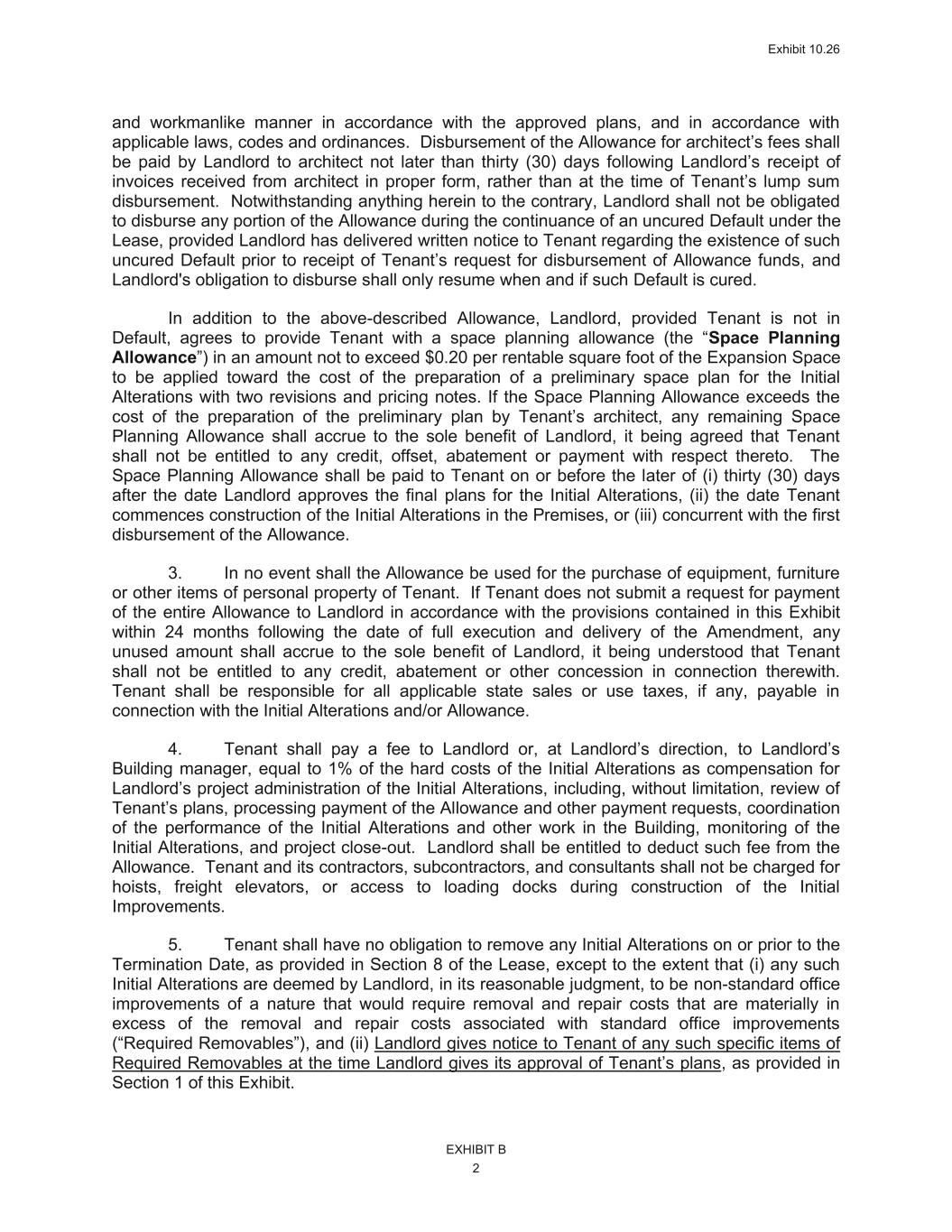 EXHIBIT B 2 and workmanlike manner in accordance with the approved plans, and in accordance with applicable laws, codes and ordinances. Disbursement of the Allowance for architect’s fees shall be paid by Landlord to architect not later than thirty (30) days following Landlord’s receipt of invoices received from architect in proper form, rather than at the time of Tenant’s lump sum disbursement. Notwithstanding anything herein to the contrary, Landlord shall not be obligated to disburse any portion of the Allowance during the continuance of an uncured Default under the Lease, provided Landlord has delivered written notice to Tenant regarding the existence of such uncured Default prior to receipt of Tenant’s request for disbursement of Allowance funds, and Landlord's obligation to disburse shall only resume when and if such Default is cured. In addition to the above-described Allowance, Landlord, provided Tenant is not in Default, agrees to provide Tenant with a space planning allowance (the “Space Planning Allowance”) in an amount not to exceed $0.20 per rentable square foot of the Expansion Space to be applied toward the cost of the preparation of a preliminary space plan for the Initial Alterations with two revisions and pricing notes. If the Space Planning Allowance exceeds the cost of the preparation of the preliminary plan by Tenant’s architect, any remaining Space Planning Allowance shall accrue to the sole benefit of Landlord, it being agreed that Tenant shall not be entitled to any credit, offset, abatement or payment with respect thereto. The Space Planning Allowance shall be paid to Tenant on or before the later of (i) thirty (30) days after the date Landlord approves the final plans for the Initial Alterations, (ii) the date Tenant commences construction of the Initial Alterations in the Premises, or (iii) concurrent with the first disbursement of the Allowance. 3. In no event shall the Allowance be used for the purchase of equipment, furniture or other items of personal property of Tenant. If Tenant does not submit a request for payment of the entire Allowance to Landlord in accordance with the provisions contained in this Exhibit within 24 months following the date of full execution and delivery of the Amendment, any unused amount shall accrue to the sole benefit of Landlord, it being understood that Tenant shall not be entitled to any credit, abatement or other concession in connection therewith. Tenant shall be responsible for all applicable state sales or use taxes, if any, payable in connection with the Initial Alterations and/or Allowance. 4. Tenant shall pay a fee to Landlord or, at Landlord’s direction, to Landlord’s Building manager, equal to 1% of the hard costs of the Initial Alterations as compensation for Landlord’s project administration of the Initial Alterations, including, without limitation, review of Tenant’s plans, processing payment of the Allowance and other payment requests, coordination of the performance of the Initial Alterations and other work in the Building, monitoring of the Initial Alterations, and project close-out. Landlord shall be entitled to deduct such fee from the Allowance. Tenant and its contractors, subcontractors, and consultants shall not be charged for hoists, freight elevators, or access to loading docks during construction of the Initial Improvements. 5. Tenant shall have no obligation to remove any Initial Alterations on or prior to the Termination Date, as provided in Section 8 of the Lease, except to the extent that (i) any such Initial Alterations are deemed by Landlord, in its reasonable judgment, to be non-standard office improvements of a nature that would require removal and repair costs that are materially in excess of the removal and repair costs associated with standard office improvements (“Required Removables”), and (ii) Landlord gives notice to Tenant of any such specific items of Required Removables at the time Landlord gives its approval of Tenant’s plans, as provided in Section 1 of this Exhibit. Exhibit 10.26