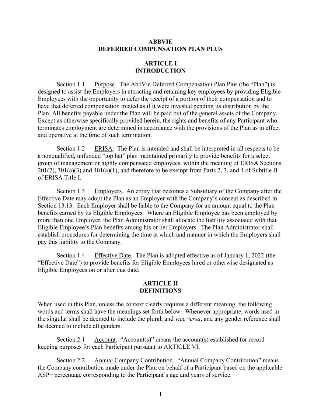 1 ABBVIE DEFERRED COMPENSATION PLAN PLUS ARTICLE I INTRODUCTION Section 1.1 Purpose. The AbbVie Deferred Compensation Plan Plus (the “Plan”) is designed to assist the Employers in attracting and retaining key employees by providing Eligible Employees with the opportunity to defer the receipt of a portion of their compensation and to have that deferred compensation treated as if it were invested pending its distribution by the Plan. All benefits payable under the Plan will be paid out of the general assets of the Company. Except as otherwise specifically provided herein, the rights and benefits of any Participant who terminates employment are determined in accordance with the provisions of the Plan as in effect and operative at the time of such termination. Section 1.2 ERISA. The Plan is intended and shall be interpreted in all respects to be a nonqualified, unfunded “top hat” plan maintained primarily to provide benefits for a select group of management or highly compensated employees, within the meaning of ERISA Sections 201(2), 301(a)(3) and 401(a)(1), and therefore to be exempt from Parts 2, 3, and 4 of Subtitle B of ERISA Title I. Section 1.3 Employers. An entity that becomes a Subsidiary of the Company after the Effective Date may adopt the Plan as an Employer with the Company’s consent as described in Section 13.13. Each Employer shall be liable to the Company for an amount equal to the Plan benefits earned by its Eligible Employees. Where an Eligible Employee has been employed by more than one Employer, the Plan Administrator shall allocate the liability associated with that Eligible Employee’s Plan benefits among his or her Employers. The Plan Administrator shall establish procedures for determining the time at which and manner in which the Employers shall pay this liability to the Company. Section 1.4 Effective Date. The Plan is adopted effective as of January 1, 2022 (the “Effective Date”) to provide benefits for Eligible Employees hired or otherwise designated as Eligible Employees on or after that date. ARTICLE II DEFINITIONS When used in this Plan, unless the context clearly requires a different meaning, the following words and terms shall have the meanings set forth below. Whenever appropriate, words used in the singular shall be deemed to include the plural, and vice versa, and any gender reference shall be deemed to include all genders. Section 2.1 Account. “Account(s)” means the account(s) established for record keeping purposes for each Participant pursuant to ARTICLE VI. Section 2.2 Annual Company Contribution. “Annual Company Contribution” means the Company contribution made under the Plan on behalf of a Participant based on the applicable ASP+ percentage corresponding to the Participant’s age and years of service.