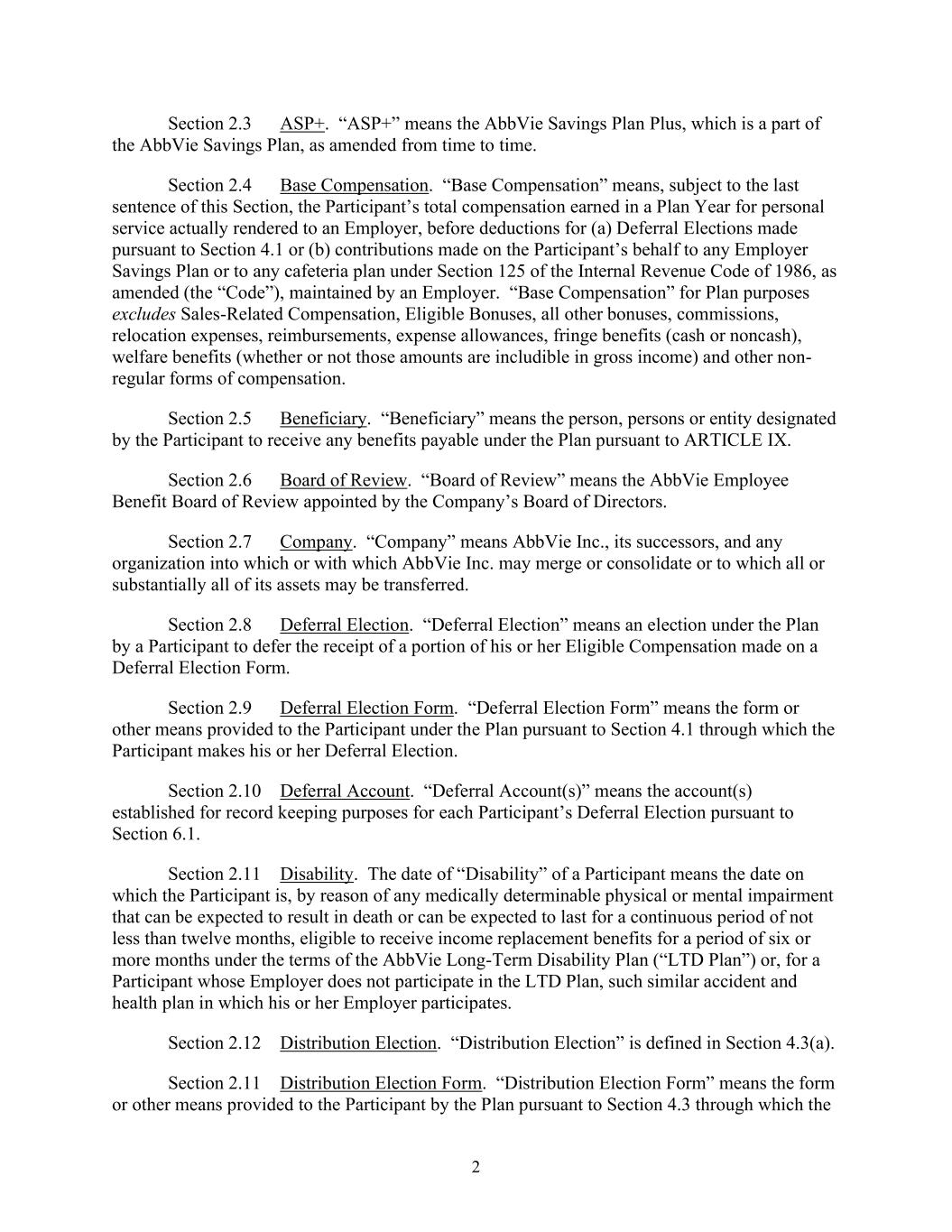 2 Section 2.3 ASP+. “ASP+” means the AbbVie Savings Plan Plus, which is a part of the AbbVie Savings Plan, as amended from time to time. Section 2.4 Base Compensation. “Base Compensation” means, subject to the last sentence of this Section, the Participant’s total compensation earned in a Plan Year for personal service actually rendered to an Employer, before deductions for (a) Deferral Elections made pursuant to Section 4.1 or (b) contributions made on the Participant’s behalf to any Employer Savings Plan or to any cafeteria plan under Section 125 of the Internal Revenue Code of 1986, as amended (the “Code”), maintained by an Employer. “Base Compensation” for Plan purposes excludes Sales-Related Compensation, Eligible Bonuses, all other bonuses, commissions, relocation expenses, reimbursements, expense allowances, fringe benefits (cash or noncash), welfare benefits (whether or not those amounts are includible in gross income) and other non- regular forms of compensation. Section 2.5 Beneficiary. “Beneficiary” means the person, persons or entity designated by the Participant to receive any benefits payable under the Plan pursuant to ARTICLE IX. Section 2.6 Board of Review. “Board of Review” means the AbbVie Employee Benefit Board of Review appointed by the Company’s Board of Directors. Section 2.7 Company. “Company” means AbbVie Inc., its successors, and any organization into which or with which AbbVie Inc. may merge or consolidate or to which all or substantially all of its assets may be transferred. Section 2.8 Deferral Election. “Deferral Election” means an election under the Plan by a Participant to defer the receipt of a portion of his or her Eligible Compensation made on a Deferral Election Form. Section 2.9 Deferral Election Form. “Deferral Election Form” means the form or other means provided to the Participant under the Plan pursuant to Section 4.1 through which the Participant makes his or her Deferral Election. Section 2.10 Deferral Account. “Deferral Account(s)” means the account(s) established for record keeping purposes for each Participant’s Deferral Election pursuant to Section 6.1. Section 2.11 Disability. The date of “Disability” of a Participant means the date on which the Participant is, by reason of any medically determinable physical or mental impairment that can be expected to result in death or can be expected to last for a continuous period of not less than twelve months, eligible to receive income replacement benefits for a period of six or more months under the terms of the AbbVie Long-Term Disability Plan (“LTD Plan”) or, for a Participant whose Employer does not participate in the LTD Plan, such similar accident and health plan in which his or her Employer participates. Section 2.12 Distribution Election. “Distribution Election” is defined in Section 4.3(a). Section 2.11 Distribution Election Form. “Distribution Election Form” means the form or other means provided to the Participant by the Plan pursuant to Section 4.3 through which the