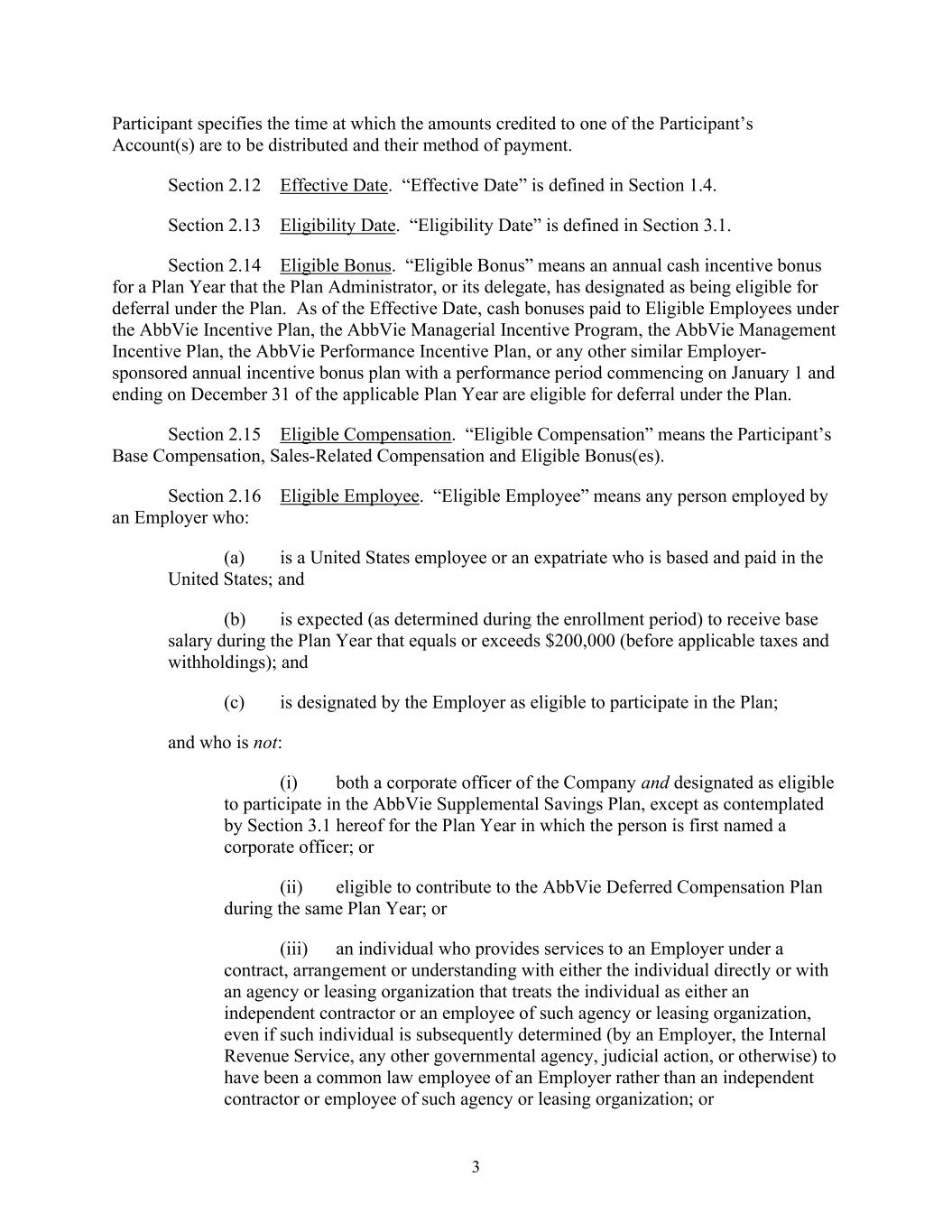 3 Participant specifies the time at which the amounts credited to one of the Participant’s Account(s) are to be distributed and their method of payment. Section 2.12 Effective Date. “Effective Date” is defined in Section 1.4. Section 2.13 Eligibility Date. “Eligibility Date” is defined in Section 3.1. Section 2.14 Eligible Bonus. “Eligible Bonus” means an annual cash incentive bonus for a Plan Year that the Plan Administrator, or its delegate, has designated as being eligible for deferral under the Plan. As of the Effective Date, cash bonuses paid to Eligible Employees under the AbbVie Incentive Plan, the AbbVie Managerial Incentive Program, the AbbVie Management Incentive Plan, the AbbVie Performance Incentive Plan, or any other similar Employer- sponsored annual incentive bonus plan with a performance period commencing on January 1 and ending on December 31 of the applicable Plan Year are eligible for deferral under the Plan. Section 2.15 Eligible Compensation. “Eligible Compensation” means the Participant’s Base Compensation, Sales-Related Compensation and Eligible Bonus(es). Section 2.16 Eligible Employee. “Eligible Employee” means any person employed by an Employer who: (a) is a United States employee or an expatriate who is based and paid in the United States; and (b) is expected (as determined during the enrollment period) to receive base salary during the Plan Year that equals or exceeds $200,000 (before applicable taxes and withholdings); and (c) is designated by the Employer as eligible to participate in the Plan; and who is not: (i) both a corporate officer of the Company and designated as eligible to participate in the AbbVie Supplemental Savings Plan, except as contemplated by Section 3.1 hereof for the Plan Year in which the person is first named a corporate officer; or (ii) eligible to contribute to the AbbVie Deferred Compensation Plan during the same Plan Year; or (iii) an individual who provides services to an Employer under a contract, arrangement or understanding with either the individual directly or with an agency or leasing organization that treats the individual as either an independent contractor or an employee of such agency or leasing organization, even if such individual is subsequently determined (by an Employer, the Internal Revenue Service, any other governmental agency, judicial action, or otherwise) to have been a common law employee of an Employer rather than an independent contractor or employee of such agency or leasing organization; or