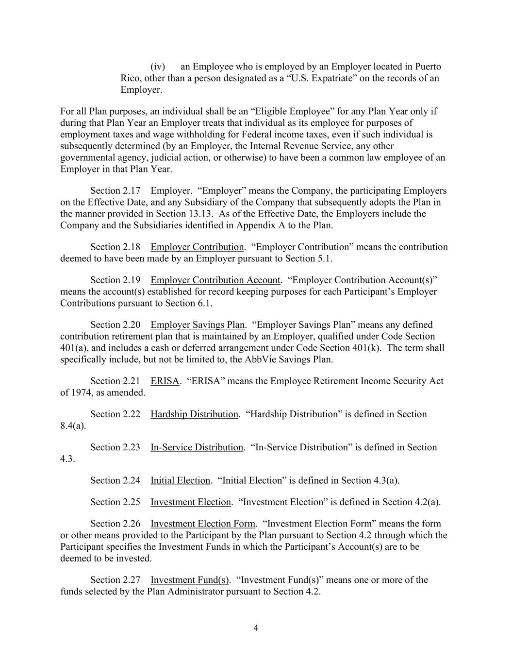 4 (iv) an Employee who is employed by an Employer located in Puerto Rico, other than a person designated as a “U.S. Expatriate” on the records of an Employer. For all Plan purposes, an individual shall be an “Eligible Employee” for any Plan Year only if during that Plan Year an Employer treats that individual as its employee for purposes of employment taxes and wage withholding for Federal income taxes, even if such individual is subsequently determined (by an Employer, the Internal Revenue Service, any other governmental agency, judicial action, or otherwise) to have been a common law employee of an Employer in that Plan Year. Section 2.17 Employer. “Employer” means the Company, the participating Employers on the Effective Date, and any Subsidiary of the Company that subsequently adopts the Plan in the manner provided in Section 13.13. As of the Effective Date, the Employers include the Company and the Subsidiaries identified in Appendix A to the Plan. Section 2.18 Employer Contribution. “Employer Contribution” means the contribution deemed to have been made by an Employer pursuant to Section 5.1. Section 2.19 Employer Contribution Account. “Employer Contribution Account(s)” means the account(s) established for record keeping purposes for each Participant’s Employer Contributions pursuant to Section 6.1. Section 2.20 Employer Savings Plan. “Employer Savings Plan” means any defined contribution retirement plan that is maintained by an Employer, qualified under Code Section 401(a), and includes a cash or deferred arrangement under Code Section 401(k). The term shall specifically include, but not be limited to, the AbbVie Savings Plan. Section 2.21 ERISA. “ERISA” means the Employee Retirement Income Security Act of 1974, as amended. Section 2.22 Hardship Distribution. “Hardship Distribution” is defined in Section 8.4(a). Section 2.23 In-Service Distribution. “In-Service Distribution” is defined in Section 4.3. Section 2.24 Initial Election. “Initial Election” is defined in Section 4.3(a). Section 2.25 Investment Election. “Investment Election” is defined in Section 4.2(a). Section 2.26 Investment Election Form. “Investment Election Form” means the form or other means provided to the Participant by the Plan pursuant to Section 4.2 through which the Participant specifies the Investment Funds in which the Participant’s Account(s) are to be deemed to be invested. Section 2.27 Investment Fund(s). “Investment Fund(s)” means one or more of the funds selected by the Plan Administrator pursuant to Section 4.2.