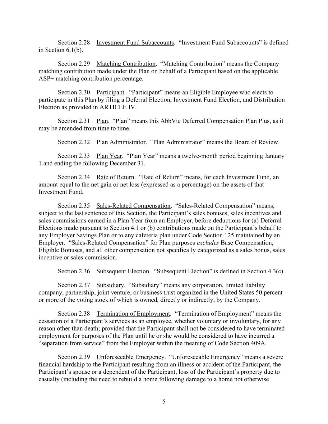 5 Section 2.28 Investment Fund Subaccounts. “Investment Fund Subaccounts” is defined in Section 6.1(b). Section 2.29 Matching Contribution. “Matching Contribution” means the Company matching contribution made under the Plan on behalf of a Participant based on the applicable ASP+ matching contribution percentage. Section 2.30 Participant. “Participant” means an Eligible Employee who elects to participate in this Plan by filing a Deferral Election, Investment Fund Election, and Distribution Election as provided in ARTICLE IV. Section 2.31 Plan. “Plan” means this AbbVie Deferred Compensation Plan Plus, as it may be amended from time to time. Section 2.32 Plan Administrator. “Plan Administrator” means the Board of Review. Section 2.33 Plan Year. “Plan Year” means a twelve-month period beginning January 1 and ending the following December 31. Section 2.34 Rate of Return. “Rate of Return” means, for each Investment Fund, an amount equal to the net gain or net loss (expressed as a percentage) on the assets of that Investment Fund. Section 2.35 Sales-Related Compensation. “Sales-Related Compensation” means, subject to the last sentence of this Section, the Participant’s sales bonuses, sales incentives and sales commissions earned in a Plan Year from an Employer, before deductions for (a) Deferral Elections made pursuant to Section 4.1 or (b) contributions made on the Participant’s behalf to any Employer Savings Plan or to any cafeteria plan under Code Section 125 maintained by an Employer. “Sales-Related Compensation” for Plan purposes excludes Base Compensation, Eligible Bonuses, and all other compensation not specifically categorized as a sales bonus, sales incentive or sales commission. Section 2.36 Subsequent Election. “Subsequent Election” is defined in Section 4.3(c). Section 2.37 Subsidiary. “Subsidiary” means any corporation, limited liability company, partnership, joint venture, or business trust organized in the United States 50 percent or more of the voting stock of which is owned, directly or indirectly, by the Company. Section 2.38 Termination of Employment. “Termination of Employment” means the cessation of a Participant’s services as an employee, whether voluntary or involuntary, for any reason other than death; provided that the Participant shall not be considered to have terminated employment for purposes of the Plan until he or she would be considered to have incurred a “separation from service” from the Employer within the meaning of Code Section 409A. Section 2.39 Unforeseeable Emergency. “Unforeseeable Emergency” means a severe financial hardship to the Participant resulting from an illness or accident of the Participant, the Participant’s spouse or a dependent of the Participant, loss of the Participant’s property due to casualty (including the need to rebuild a home following damage to a home not otherwise
