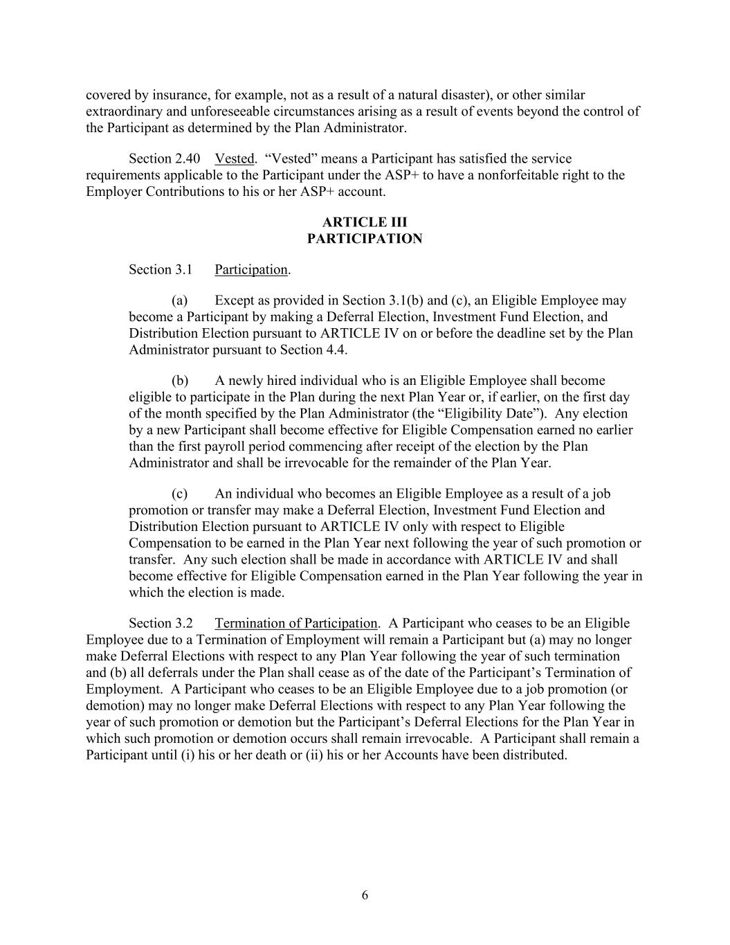 6 covered by insurance, for example, not as a result of a natural disaster), or other similar extraordinary and unforeseeable circumstances arising as a result of events beyond the control of the Participant as determined by the Plan Administrator. Section 2.40 Vested. “Vested” means a Participant has satisfied the service requirements applicable to the Participant under the ASP+ to have a nonforfeitable right to the Employer Contributions to his or her ASP+ account. ARTICLE III PARTICIPATION Section 3.1 Participation. (a) Except as provided in Section 3.1(b) and (c), an Eligible Employee may become a Participant by making a Deferral Election, Investment Fund Election, and Distribution Election pursuant to ARTICLE IV on or before the deadline set by the Plan Administrator pursuant to Section 4.4. (b) A newly hired individual who is an Eligible Employee shall become eligible to participate in the Plan during the next Plan Year or, if earlier, on the first day of the month specified by the Plan Administrator (the “Eligibility Date”). Any election by a new Participant shall become effective for Eligible Compensation earned no earlier than the first payroll period commencing after receipt of the election by the Plan Administrator and shall be irrevocable for the remainder of the Plan Year. (c) An individual who becomes an Eligible Employee as a result of a job promotion or transfer may make a Deferral Election, Investment Fund Election and Distribution Election pursuant to ARTICLE IV only with respect to Eligible Compensation to be earned in the Plan Year next following the year of such promotion or transfer. Any such election shall be made in accordance with ARTICLE IV and shall become effective for Eligible Compensation earned in the Plan Year following the year in which the election is made. Section 3.2 Termination of Participation. A Participant who ceases to be an Eligible Employee due to a Termination of Employment will remain a Participant but (a) may no longer make Deferral Elections with respect to any Plan Year following the year of such termination and (b) all deferrals under the Plan shall cease as of the date of the Participant’s Termination of Employment. A Participant who ceases to be an Eligible Employee due to a job promotion (or demotion) may no longer make Deferral Elections with respect to any Plan Year following the year of such promotion or demotion but the Participant’s Deferral Elections for the Plan Year in which such promotion or demotion occurs shall remain irrevocable. A Participant shall remain a Participant until (i) his or her death or (ii) his or her Accounts have been distributed.