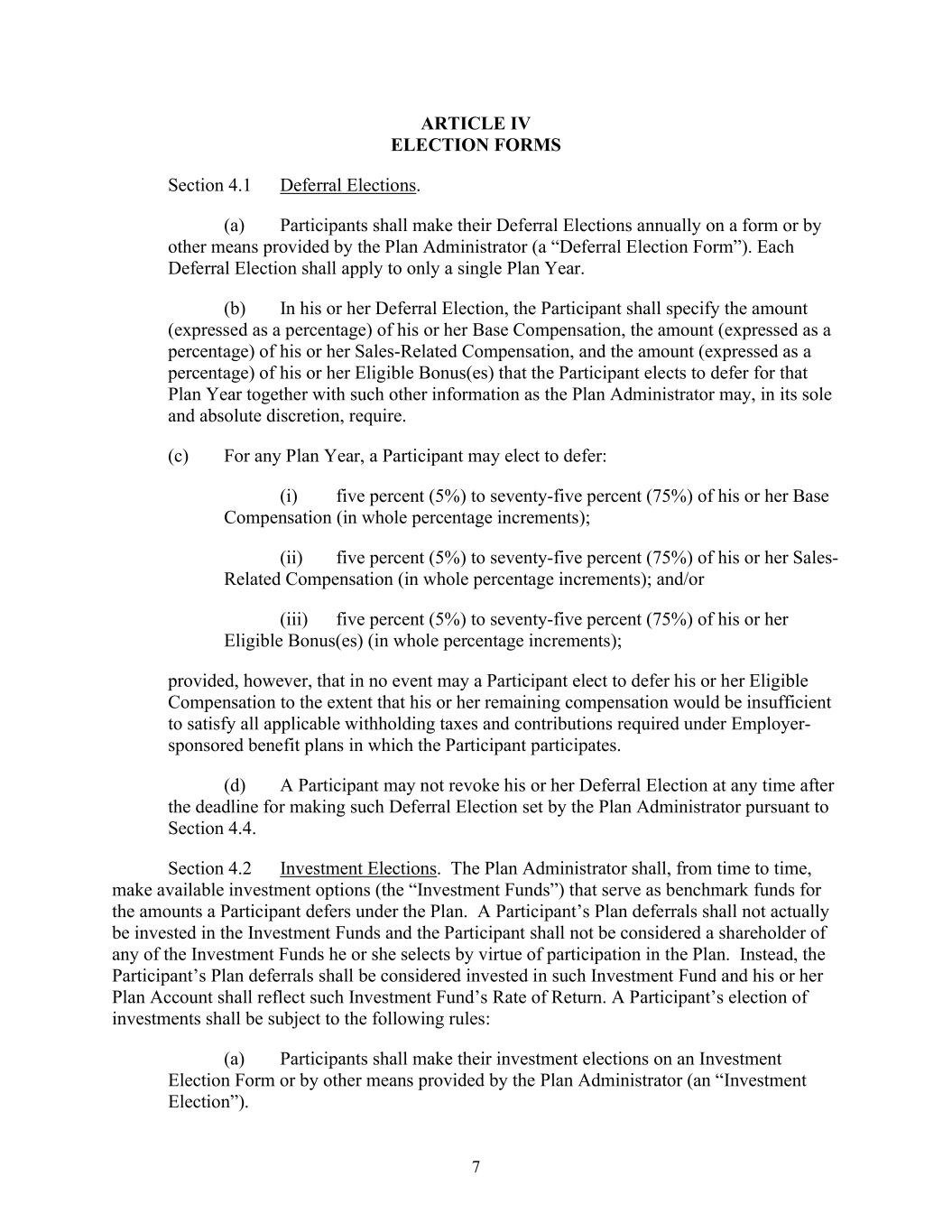 7 ARTICLE IV ELECTION FORMS Section 4.1 Deferral Elections. (a) Participants shall make their Deferral Elections annually on a form or by other means provided by the Plan Administrator (a “Deferral Election Form”). Each Deferral Election shall apply to only a single Plan Year. (b) In his or her Deferral Election, the Participant shall specify the amount (expressed as a percentage) of his or her Base Compensation, the amount (expressed as a percentage) of his or her Sales-Related Compensation, and the amount (expressed as a percentage) of his or her Eligible Bonus(es) that the Participant elects to defer for that Plan Year together with such other information as the Plan Administrator may, in its sole and absolute discretion, require. (c) For any Plan Year, a Participant may elect to defer: (i) five percent (5%) to seventy-five percent (75%) of his or her Base Compensation (in whole percentage increments); (ii) five percent (5%) to seventy-five percent (75%) of his or her Sales- Related Compensation (in whole percentage increments); and/or (iii) five percent (5%) to seventy-five percent (75%) of his or her Eligible Bonus(es) (in whole percentage increments); provided, however, that in no event may a Participant elect to defer his or her Eligible Compensation to the extent that his or her remaining compensation would be insufficient to satisfy all applicable withholding taxes and contributions required under Employer- sponsored benefit plans in which the Participant participates. (d) A Participant may not revoke his or her Deferral Election at any time after the deadline for making such Deferral Election set by the Plan Administrator pursuant to Section 4.4. Section 4.2 Investment Elections. The Plan Administrator shall, from time to time, make available investment options (the “Investment Funds”) that serve as benchmark funds for the amounts a Participant defers under the Plan. A Participant’s Plan deferrals shall not actually be invested in the Investment Funds and the Participant shall not be considered a shareholder of any of the Investment Funds he or she selects by virtue of participation in the Plan. Instead, the Participant’s Plan deferrals shall be considered invested in such Investment Fund and his or her Plan Account shall reflect such Investment Fund’s Rate of Return. A Participant’s election of investments shall be subject to the following rules: (a) Participants shall make their investment elections on an Investment Election Form or by other means provided by the Plan Administrator (an “Investment Election”).
