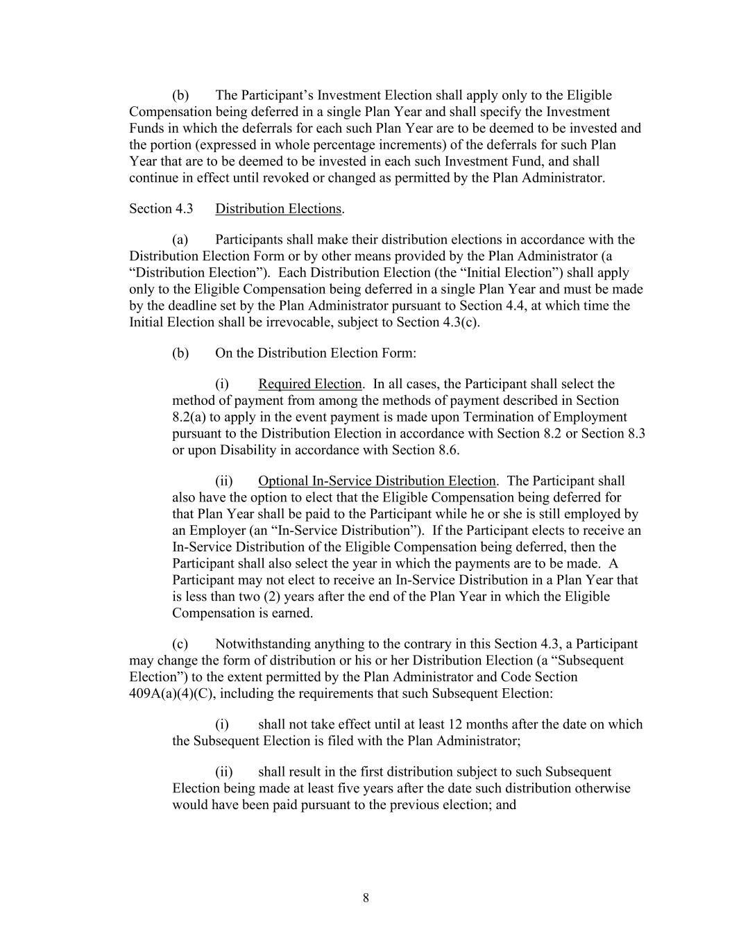 8 (b) The Participant’s Investment Election shall apply only to the Eligible Compensation being deferred in a single Plan Year and shall specify the Investment Funds in which the deferrals for each such Plan Year are to be deemed to be invested and the portion (expressed in whole percentage increments) of the deferrals for such Plan Year that are to be deemed to be invested in each such Investment Fund, and shall continue in effect until revoked or changed as permitted by the Plan Administrator. Section 4.3 Distribution Elections. (a) Participants shall make their distribution elections in accordance with the Distribution Election Form or by other means provided by the Plan Administrator (a “Distribution Election”). Each Distribution Election (the “Initial Election”) shall apply only to the Eligible Compensation being deferred in a single Plan Year and must be made by the deadline set by the Plan Administrator pursuant to Section 4.4, at which time the Initial Election shall be irrevocable, subject to Section 4.3(c). (b) On the Distribution Election Form: (i) Required Election. In all cases, the Participant shall select the method of payment from among the methods of payment described in Section 8.2(a) to apply in the event payment is made upon Termination of Employment pursuant to the Distribution Election in accordance with Section 8.2 or Section 8.3 or upon Disability in accordance with Section 8.6. (ii) Optional In-Service Distribution Election. The Participant shall also have the option to elect that the Eligible Compensation being deferred for that Plan Year shall be paid to the Participant while he or she is still employed by an Employer (an “In-Service Distribution”). If the Participant elects to receive an In-Service Distribution of the Eligible Compensation being deferred, then the Participant shall also select the year in which the payments are to be made. A Participant may not elect to receive an In-Service Distribution in a Plan Year that is less than two (2) years after the end of the Plan Year in which the Eligible Compensation is earned. (c) Notwithstanding anything to the contrary in this Section 4.3, a Participant may change the form of distribution or his or her Distribution Election (a “Subsequent Election”) to the extent permitted by the Plan Administrator and Code Section 409A(a)(4)(C), including the requirements that such Subsequent Election: (i) shall not take effect until at least 12 months after the date on which the Subsequent Election is filed with the Plan Administrator; (ii) shall result in the first distribution subject to such Subsequent Election being made at least five years after the date such distribution otherwise would have been paid pursuant to the previous election; and