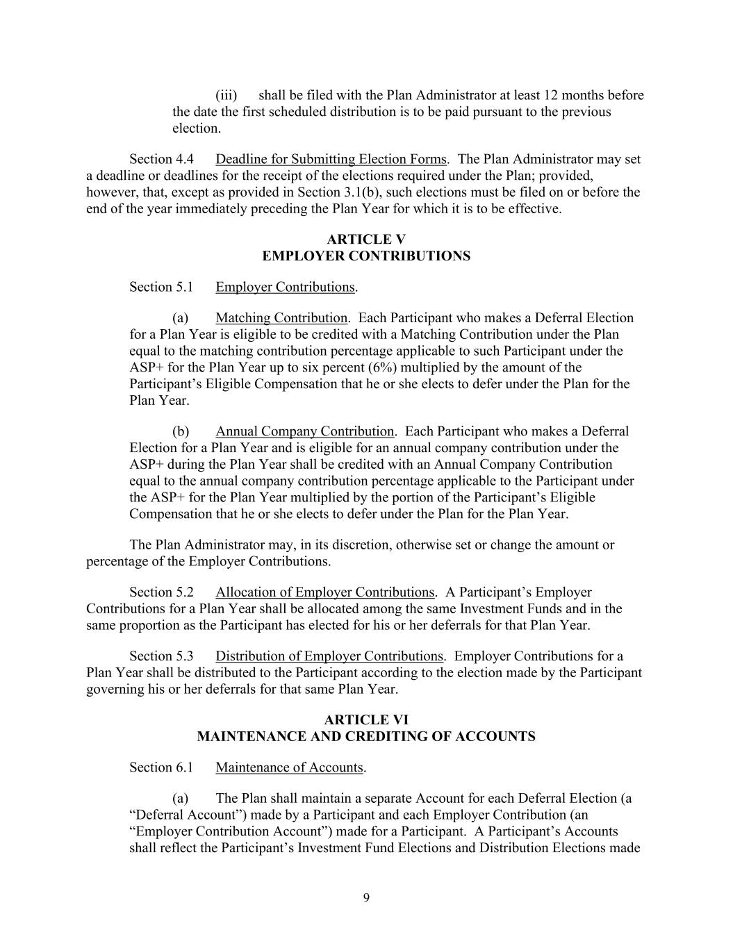 9 (iii) shall be filed with the Plan Administrator at least 12 months before the date the first scheduled distribution is to be paid pursuant to the previous election. Section 4.4 Deadline for Submitting Election Forms. The Plan Administrator may set a deadline or deadlines for the receipt of the elections required under the Plan; provided, however, that, except as provided in Section 3.1(b), such elections must be filed on or before the end of the year immediately preceding the Plan Year for which it is to be effective. ARTICLE V EMPLOYER CONTRIBUTIONS Section 5.1 Employer Contributions. (a) Matching Contribution. Each Participant who makes a Deferral Election for a Plan Year is eligible to be credited with a Matching Contribution under the Plan equal to the matching contribution percentage applicable to such Participant under the ASP+ for the Plan Year up to six percent (6%) multiplied by the amount of the Participant’s Eligible Compensation that he or she elects to defer under the Plan for the Plan Year. (b) Annual Company Contribution. Each Participant who makes a Deferral Election for a Plan Year and is eligible for an annual company contribution under the ASP+ during the Plan Year shall be credited with an Annual Company Contribution equal to the annual company contribution percentage applicable to the Participant under the ASP+ for the Plan Year multiplied by the portion of the Participant’s Eligible Compensation that he or she elects to defer under the Plan for the Plan Year. The Plan Administrator may, in its discretion, otherwise set or change the amount or percentage of the Employer Contributions. Section 5.2 Allocation of Employer Contributions. A Participant’s Employer Contributions for a Plan Year shall be allocated among the same Investment Funds and in the same proportion as the Participant has elected for his or her deferrals for that Plan Year. Section 5.3 Distribution of Employer Contributions. Employer Contributions for a Plan Year shall be distributed to the Participant according to the election made by the Participant governing his or her deferrals for that same Plan Year. ARTICLE VI MAINTENANCE AND CREDITING OF ACCOUNTS Section 6.1 Maintenance of Accounts. (a) The Plan shall maintain a separate Account for each Deferral Election (a “Deferral Account”) made by a Participant and each Employer Contribution (an “Employer Contribution Account”) made for a Participant. A Participant’s Accounts shall reflect the Participant’s Investment Fund Elections and Distribution Elections made