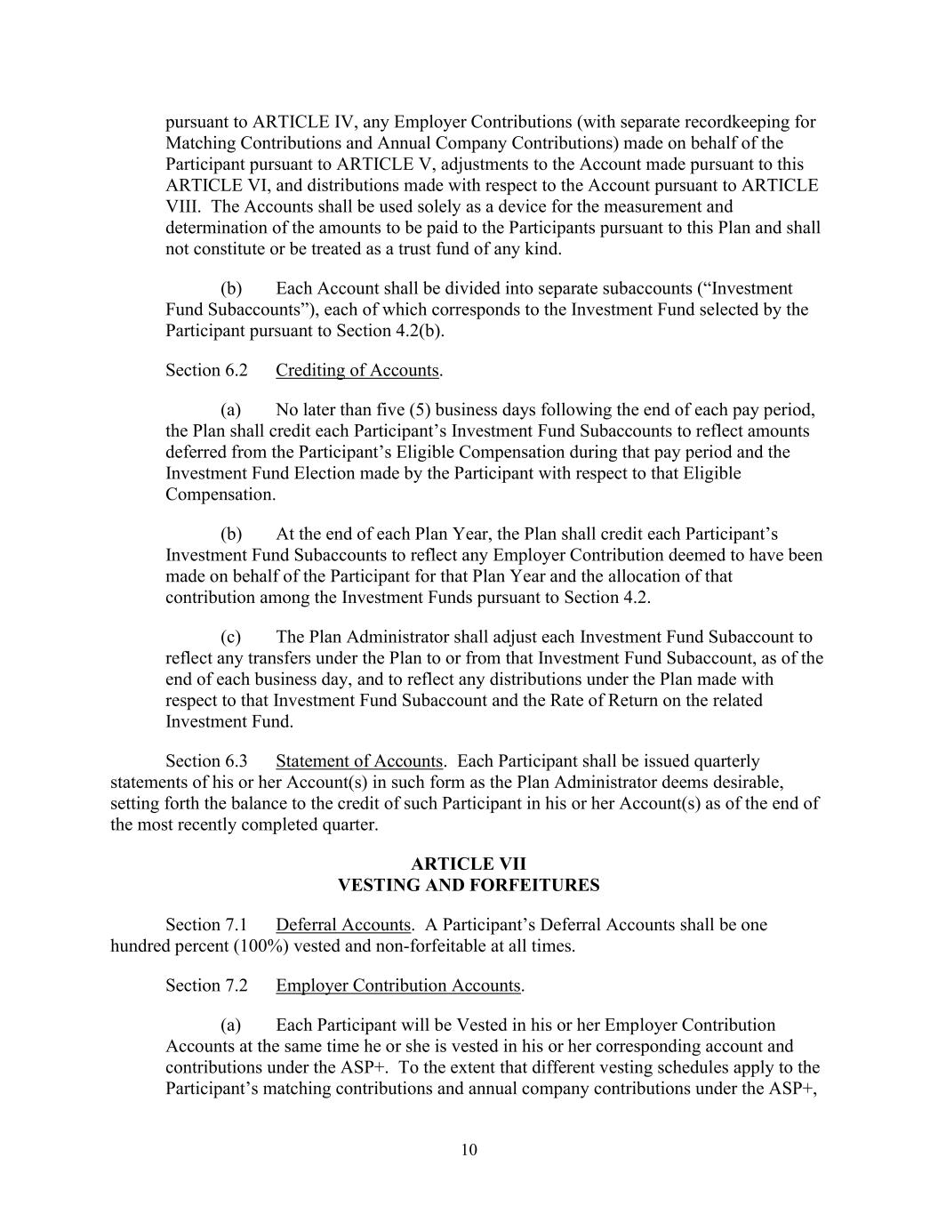 10 pursuant to ARTICLE IV, any Employer Contributions (with separate recordkeeping for Matching Contributions and Annual Company Contributions) made on behalf of the Participant pursuant to ARTICLE V, adjustments to the Account made pursuant to this ARTICLE VI, and distributions made with respect to the Account pursuant to ARTICLE VIII. The Accounts shall be used solely as a device for the measurement and determination of the amounts to be paid to the Participants pursuant to this Plan and shall not constitute or be treated as a trust fund of any kind. (b) Each Account shall be divided into separate subaccounts (“Investment Fund Subaccounts”), each of which corresponds to the Investment Fund selected by the Participant pursuant to Section 4.2(b). Section 6.2 Crediting of Accounts. (a) No later than five (5) business days following the end of each pay period, the Plan shall credit each Participant’s Investment Fund Subaccounts to reflect amounts deferred from the Participant’s Eligible Compensation during that pay period and the Investment Fund Election made by the Participant with respect to that Eligible Compensation. (b) At the end of each Plan Year, the Plan shall credit each Participant’s Investment Fund Subaccounts to reflect any Employer Contribution deemed to have been made on behalf of the Participant for that Plan Year and the allocation of that contribution among the Investment Funds pursuant to Section 4.2. (c) The Plan Administrator shall adjust each Investment Fund Subaccount to reflect any transfers under the Plan to or from that Investment Fund Subaccount, as of the end of each business day, and to reflect any distributions under the Plan made with respect to that Investment Fund Subaccount and the Rate of Return on the related Investment Fund. Section 6.3 Statement of Accounts. Each Participant shall be issued quarterly statements of his or her Account(s) in such form as the Plan Administrator deems desirable, setting forth the balance to the credit of such Participant in his or her Account(s) as of the end of the most recently completed quarter. ARTICLE VII VESTING AND FORFEITURES Section 7.1 Deferral Accounts. A Participant’s Deferral Accounts shall be one hundred percent (100%) vested and non-forfeitable at all times. Section 7.2 Employer Contribution Accounts. (a) Each Participant will be Vested in his or her Employer Contribution Accounts at the same time he or she is vested in his or her corresponding account and contributions under the ASP+. To the extent that different vesting schedules apply to the Participant’s matching contributions and annual company contributions under the ASP+,
