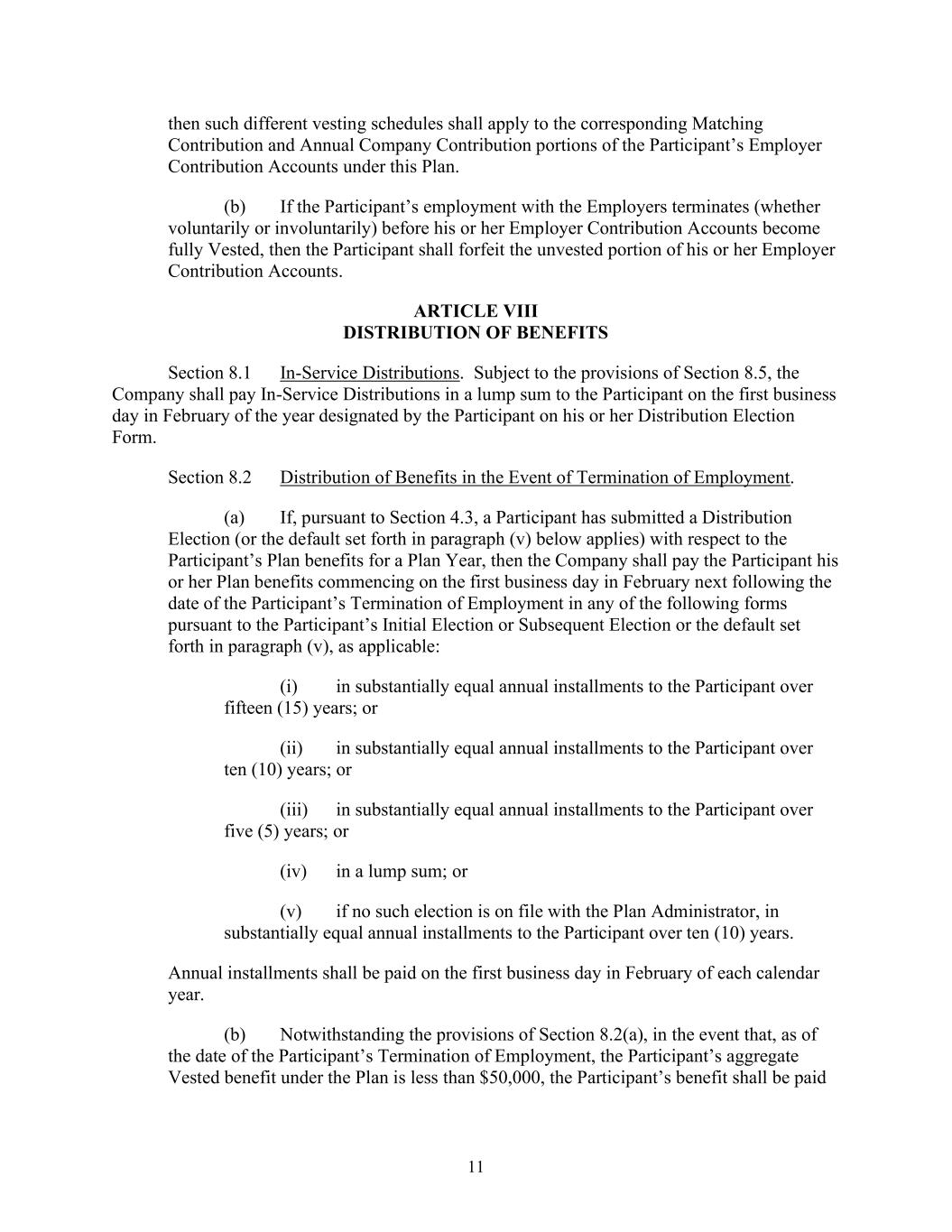 11 then such different vesting schedules shall apply to the corresponding Matching Contribution and Annual Company Contribution portions of the Participant’s Employer Contribution Accounts under this Plan. (b) If the Participant’s employment with the Employers terminates (whether voluntarily or involuntarily) before his or her Employer Contribution Accounts become fully Vested, then the Participant shall forfeit the unvested portion of his or her Employer Contribution Accounts. ARTICLE VIII DISTRIBUTION OF BENEFITS Section 8.1 In-Service Distributions. Subject to the provisions of Section 8.5, the Company shall pay In-Service Distributions in a lump sum to the Participant on the first business day in February of the year designated by the Participant on his or her Distribution Election Form. Section 8.2 Distribution of Benefits in the Event of Termination of Employment. (a) If, pursuant to Section 4.3, a Participant has submitted a Distribution Election (or the default set forth in paragraph (v) below applies) with respect to the Participant’s Plan benefits for a Plan Year, then the Company shall pay the Participant his or her Plan benefits commencing on the first business day in February next following the date of the Participant’s Termination of Employment in any of the following forms pursuant to the Participant’s Initial Election or Subsequent Election or the default set forth in paragraph (v), as applicable: (i) in substantially equal annual installments to the Participant over fifteen (15) years; or (ii) in substantially equal annual installments to the Participant over ten (10) years; or (iii) in substantially equal annual installments to the Participant over five (5) years; or (iv) in a lump sum; or (v) if no such election is on file with the Plan Administrator, in substantially equal annual installments to the Participant over ten (10) years. Annual installments shall be paid on the first business day in February of each calendar year. (b) Notwithstanding the provisions of Section 8.2(a), in the event that, as of the date of the Participant’s Termination of Employment, the Participant’s aggregate Vested benefit under the Plan is less than $50,000, the Participant’s benefit shall be paid