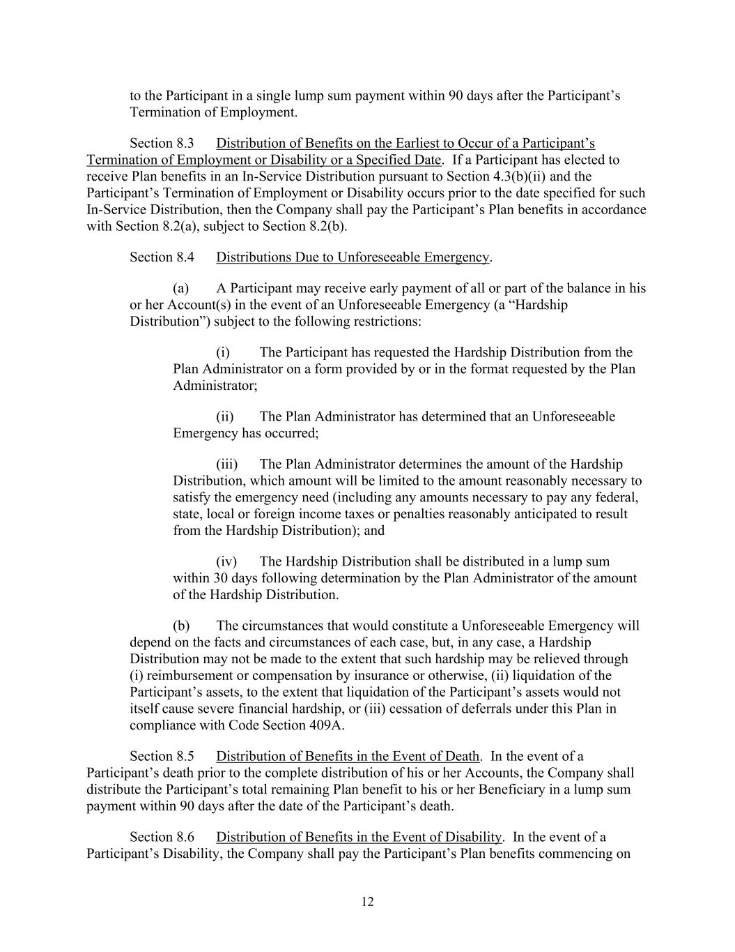 12 to the Participant in a single lump sum payment within 90 days after the Participant’s Termination of Employment. Section 8.3 Distribution of Benefits on the Earliest to Occur of a Participant’s Termination of Employment or Disability or a Specified Date. If a Participant has elected to receive Plan benefits in an In-Service Distribution pursuant to Section 4.3(b)(ii) and the Participant’s Termination of Employment or Disability occurs prior to the date specified for such In-Service Distribution, then the Company shall pay the Participant’s Plan benefits in accordance with Section 8.2(a), subject to Section 8.2(b). Section 8.4 Distributions Due to Unforeseeable Emergency. (a) A Participant may receive early payment of all or part of the balance in his or her Account(s) in the event of an Unforeseeable Emergency (a “Hardship Distribution”) subject to the following restrictions: (i) The Participant has requested the Hardship Distribution from the Plan Administrator on a form provided by or in the format requested by the Plan Administrator; (ii) The Plan Administrator has determined that an Unforeseeable Emergency has occurred; (iii) The Plan Administrator determines the amount of the Hardship Distribution, which amount will be limited to the amount reasonably necessary to satisfy the emergency need (including any amounts necessary to pay any federal, state, local or foreign income taxes or penalties reasonably anticipated to result from the Hardship Distribution); and (iv) The Hardship Distribution shall be distributed in a lump sum within 30 days following determination by the Plan Administrator of the amount of the Hardship Distribution. (b) The circumstances that would constitute a Unforeseeable Emergency will depend on the facts and circumstances of each case, but, in any case, a Hardship Distribution may not be made to the extent that such hardship may be relieved through (i) reimbursement or compensation by insurance or otherwise, (ii) liquidation of the Participant’s assets, to the extent that liquidation of the Participant’s assets would not itself cause severe financial hardship, or (iii) cessation of deferrals under this Plan in compliance with Code Section 409A. Section 8.5 Distribution of Benefits in the Event of Death. In the event of a Participant’s death prior to the complete distribution of his or her Accounts, the Company shall distribute the Participant’s total remaining Plan benefit to his or her Beneficiary in a lump sum payment within 90 days after the date of the Participant’s death. Section 8.6 Distribution of Benefits in the Event of Disability. In the event of a Participant’s Disability, the Company shall pay the Participant’s Plan benefits commencing on