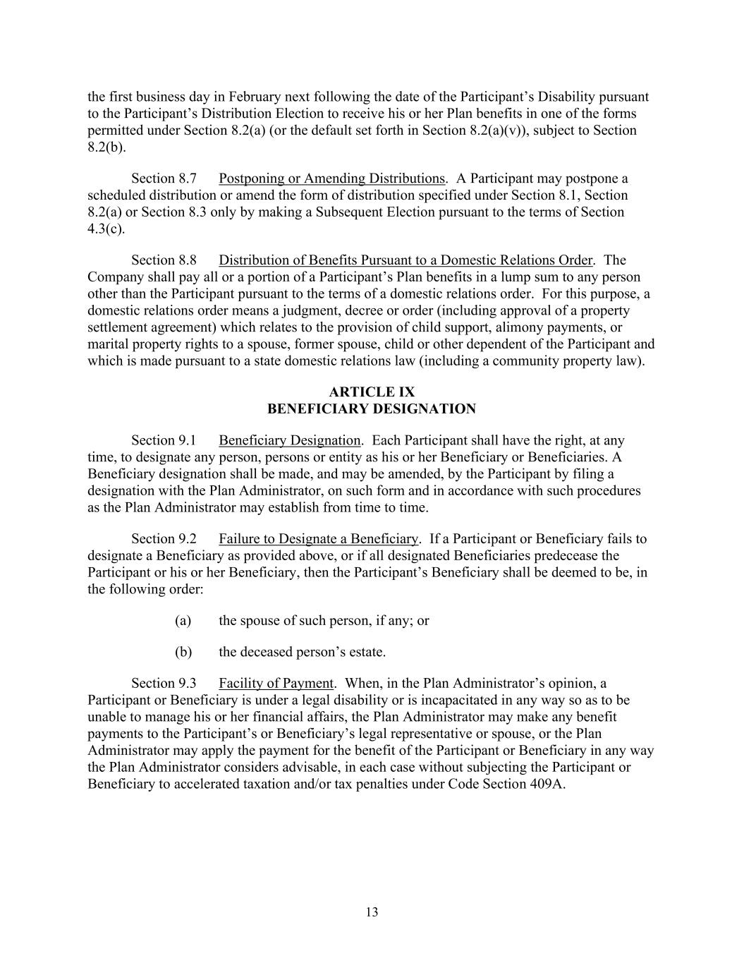 13 the first business day in February next following the date of the Participant’s Disability pursuant to the Participant’s Distribution Election to receive his or her Plan benefits in one of the forms permitted under Section 8.2(a) (or the default set forth in Section 8.2(a)(v)), subject to Section 8.2(b). Section 8.7 Postponing or Amending Distributions. A Participant may postpone a scheduled distribution or amend the form of distribution specified under Section 8.1, Section 8.2(a) or Section 8.3 only by making a Subsequent Election pursuant to the terms of Section 4.3(c). Section 8.8 Distribution of Benefits Pursuant to a Domestic Relations Order. The Company shall pay all or a portion of a Participant’s Plan benefits in a lump sum to any person other than the Participant pursuant to the terms of a domestic relations order. For this purpose, a domestic relations order means a judgment, decree or order (including approval of a property settlement agreement) which relates to the provision of child support, alimony payments, or marital property rights to a spouse, former spouse, child or other dependent of the Participant and which is made pursuant to a state domestic relations law (including a community property law). ARTICLE IX BENEFICIARY DESIGNATION Section 9.1 Beneficiary Designation. Each Participant shall have the right, at any time, to designate any person, persons or entity as his or her Beneficiary or Beneficiaries. A Beneficiary designation shall be made, and may be amended, by the Participant by filing a designation with the Plan Administrator, on such form and in accordance with such procedures as the Plan Administrator may establish from time to time. Section 9.2 Failure to Designate a Beneficiary. If a Participant or Beneficiary fails to designate a Beneficiary as provided above, or if all designated Beneficiaries predecease the Participant or his or her Beneficiary, then the Participant’s Beneficiary shall be deemed to be, in the following order: (a) the spouse of such person, if any; or (b) the deceased person’s estate. Section 9.3 Facility of Payment. When, in the Plan Administrator’s opinion, a Participant or Beneficiary is under a legal disability or is incapacitated in any way so as to be unable to manage his or her financial affairs, the Plan Administrator may make any benefit payments to the Participant’s or Beneficiary’s legal representative or spouse, or the Plan Administrator may apply the payment for the benefit of the Participant or Beneficiary in any way the Plan Administrator considers advisable, in each case without subjecting the Participant or Beneficiary to accelerated taxation and/or tax penalties under Code Section 409A.