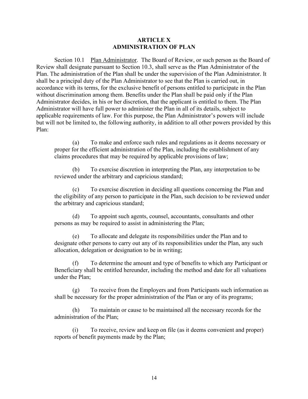 14 ARTICLE X ADMINISTRATION OF PLAN Section 10.1 Plan Administrator. The Board of Review, or such person as the Board of Review shall designate pursuant to Section 10.3, shall serve as the Plan Administrator of the Plan. The administration of the Plan shall be under the supervision of the Plan Administrator. It shall be a principal duty of the Plan Administrator to see that the Plan is carried out, in accordance with its terms, for the exclusive benefit of persons entitled to participate in the Plan without discrimination among them. Benefits under the Plan shall be paid only if the Plan Administrator decides, in his or her discretion, that the applicant is entitled to them. The Plan Administrator will have full power to administer the Plan in all of its details, subject to applicable requirements of law. For this purpose, the Plan Administrator’s powers will include but will not be limited to, the following authority, in addition to all other powers provided by this Plan: (a) To make and enforce such rules and regulations as it deems necessary or proper for the efficient administration of the Plan, including the establishment of any claims procedures that may be required by applicable provisions of law; (b) To exercise discretion in interpreting the Plan, any interpretation to be reviewed under the arbitrary and capricious standard; (c) To exercise discretion in deciding all questions concerning the Plan and the eligibility of any person to participate in the Plan, such decision to be reviewed under the arbitrary and capricious standard; (d) To appoint such agents, counsel, accountants, consultants and other persons as may be required to assist in administering the Plan; (e) To allocate and delegate its responsibilities under the Plan and to designate other persons to carry out any of its responsibilities under the Plan, any such allocation, delegation or designation to be in writing; (f) To determine the amount and type of benefits to which any Participant or Beneficiary shall be entitled hereunder, including the method and date for all valuations under the Plan; (g) To receive from the Employers and from Participants such information as shall be necessary for the proper administration of the Plan or any of its programs; (h) To maintain or cause to be maintained all the necessary records for the administration of the Plan; (i) To receive, review and keep on file (as it deems convenient and proper) reports of benefit payments made by the Plan;