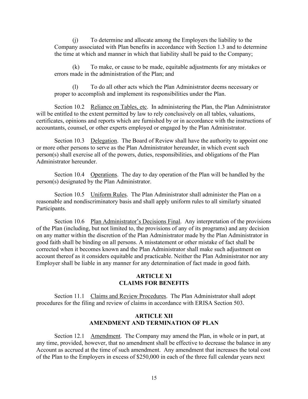 15 (j) To determine and allocate among the Employers the liability to the Company associated with Plan benefits in accordance with Section 1.3 and to determine the time at which and manner in which that liability shall be paid to the Company; (k) To make, or cause to be made, equitable adjustments for any mistakes or errors made in the administration of the Plan; and (l) To do all other acts which the Plan Administrator deems necessary or proper to accomplish and implement its responsibilities under the Plan. Section 10.2 Reliance on Tables, etc. In administering the Plan, the Plan Administrator will be entitled to the extent permitted by law to rely conclusively on all tables, valuations, certificates, opinions and reports which are furnished by or in accordance with the instructions of accountants, counsel, or other experts employed or engaged by the Plan Administrator. Section 10.3 Delegation. The Board of Review shall have the authority to appoint one or more other persons to serve as the Plan Administrator hereunder, in which event such person(s) shall exercise all of the powers, duties, responsibilities, and obligations of the Plan Administrator hereunder. Section 10.4 Operations. The day to day operation of the Plan will be handled by the person(s) designated by the Plan Administrator. Section 10.5 Uniform Rules. The Plan Administrator shall administer the Plan on a reasonable and nondiscriminatory basis and shall apply uniform rules to all similarly situated Participants. Section 10.6 Plan Administrator’s Decisions Final. Any interpretation of the provisions of the Plan (including, but not limited to, the provisions of any of its programs) and any decision on any matter within the discretion of the Plan Administrator made by the Plan Administrator in good faith shall be binding on all persons. A misstatement or other mistake of fact shall be corrected when it becomes known and the Plan Administrator shall make such adjustment on account thereof as it considers equitable and practicable. Neither the Plan Administrator nor any Employer shall be liable in any manner for any determination of fact made in good faith. ARTICLE XI CLAIMS FOR BENEFITS Section 11.1 Claims and Review Procedures. The Plan Administrator shall adopt procedures for the filing and review of claims in accordance with ERISA Section 503. ARTICLE XII AMENDMENT AND TERMINATION OF PLAN Section 12.1 Amendment. The Company may amend the Plan, in whole or in part, at any time, provided, however, that no amendment shall be effective to decrease the balance in any Account as accrued at the time of such amendment. Any amendment that increases the total cost of the Plan to the Employers in excess of $250,000 in each of the three full calendar years next