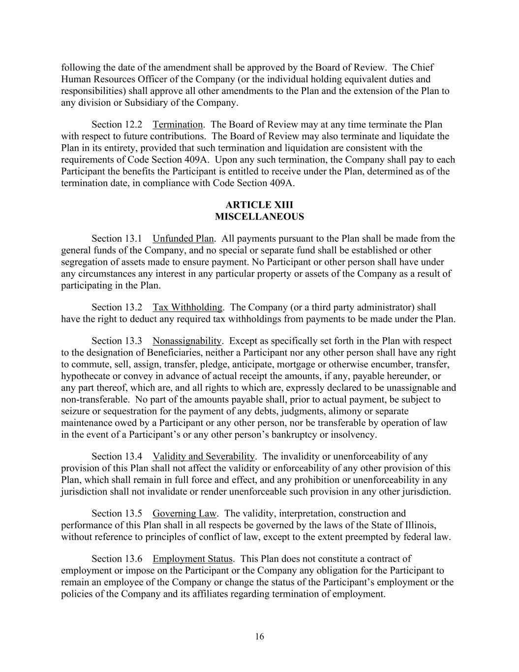 16 following the date of the amendment shall be approved by the Board of Review. The Chief Human Resources Officer of the Company (or the individual holding equivalent duties and responsibilities) shall approve all other amendments to the Plan and the extension of the Plan to any division or Subsidiary of the Company. Section 12.2 Termination. The Board of Review may at any time terminate the Plan with respect to future contributions. The Board of Review may also terminate and liquidate the Plan in its entirety, provided that such termination and liquidation are consistent with the requirements of Code Section 409A. Upon any such termination, the Company shall pay to each Participant the benefits the Participant is entitled to receive under the Plan, determined as of the termination date, in compliance with Code Section 409A. ARTICLE XIII MISCELLANEOUS Section 13.1 Unfunded Plan. All payments pursuant to the Plan shall be made from the general funds of the Company, and no special or separate fund shall be established or other segregation of assets made to ensure payment. No Participant or other person shall have under any circumstances any interest in any particular property or assets of the Company as a result of participating in the Plan. Section 13.2 Tax Withholding. The Company (or a third party administrator) shall have the right to deduct any required tax withholdings from payments to be made under the Plan. Section 13.3 Nonassignability. Except as specifically set forth in the Plan with respect to the designation of Beneficiaries, neither a Participant nor any other person shall have any right to commute, sell, assign, transfer, pledge, anticipate, mortgage or otherwise encumber, transfer, hypothecate or convey in advance of actual receipt the amounts, if any, payable hereunder, or any part thereof, which are, and all rights to which are, expressly declared to be unassignable and non-transferable. No part of the amounts payable shall, prior to actual payment, be subject to seizure or sequestration for the payment of any debts, judgments, alimony or separate maintenance owed by a Participant or any other person, nor be transferable by operation of law in the event of a Participant’s or any other person’s bankruptcy or insolvency. Section 13.4 Validity and Severability. The invalidity or unenforceability of any provision of this Plan shall not affect the validity or enforceability of any other provision of this Plan, which shall remain in full force and effect, and any prohibition or unenforceability in any jurisdiction shall not invalidate or render unenforceable such provision in any other jurisdiction. Section 13.5 Governing Law. The validity, interpretation, construction and performance of this Plan shall in all respects be governed by the laws of the State of Illinois, without reference to principles of conflict of law, except to the extent preempted by federal law. Section 13.6 Employment Status. This Plan does not constitute a contract of employment or impose on the Participant or the Company any obligation for the Participant to remain an employee of the Company or change the status of the Participant’s employment or the policies of the Company and its affiliates regarding termination of employment.