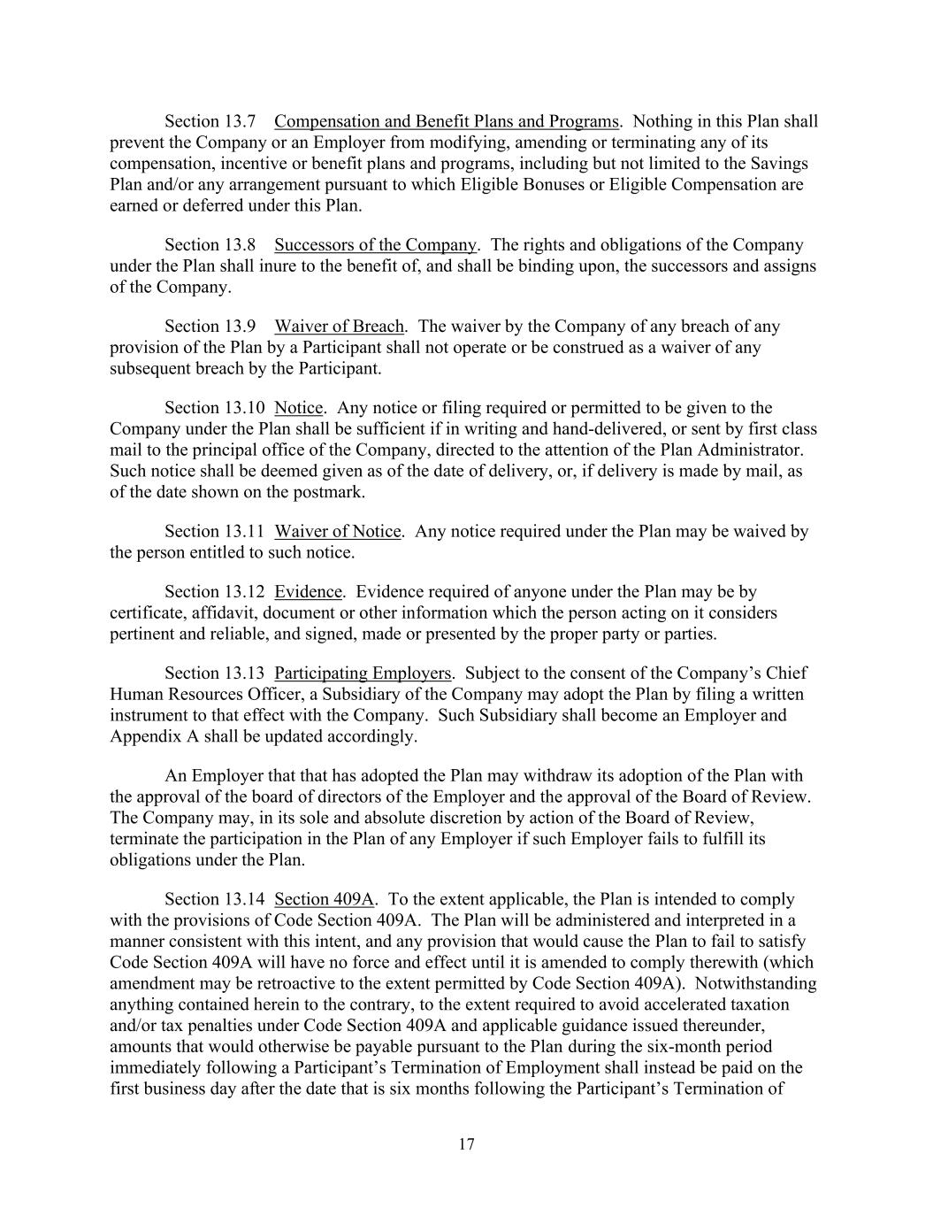 17 Section 13.7 Compensation and Benefit Plans and Programs. Nothing in this Plan shall prevent the Company or an Employer from modifying, amending or terminating any of its compensation, incentive or benefit plans and programs, including but not limited to the Savings Plan and/or any arrangement pursuant to which Eligible Bonuses or Eligible Compensation are earned or deferred under this Plan. Section 13.8 Successors of the Company. The rights and obligations of the Company under the Plan shall inure to the benefit of, and shall be binding upon, the successors and assigns of the Company. Section 13.9 Waiver of Breach. The waiver by the Company of any breach of any provision of the Plan by a Participant shall not operate or be construed as a waiver of any subsequent breach by the Participant. Section 13.10 Notice. Any notice or filing required or permitted to be given to the Company under the Plan shall be sufficient if in writing and hand-delivered, or sent by first class mail to the principal office of the Company, directed to the attention of the Plan Administrator. Such notice shall be deemed given as of the date of delivery, or, if delivery is made by mail, as of the date shown on the postmark. Section 13.11 Waiver of Notice. Any notice required under the Plan may be waived by the person entitled to such notice. Section 13.12 Evidence. Evidence required of anyone under the Plan may be by certificate, affidavit, document or other information which the person acting on it considers pertinent and reliable, and signed, made or presented by the proper party or parties. Section 13.13 Participating Employers. Subject to the consent of the Company’s Chief Human Resources Officer, a Subsidiary of the Company may adopt the Plan by filing a written instrument to that effect with the Company. Such Subsidiary shall become an Employer and Appendix A shall be updated accordingly. An Employer that that has adopted the Plan may withdraw its adoption of the Plan with the approval of the board of directors of the Employer and the approval of the Board of Review. The Company may, in its sole and absolute discretion by action of the Board of Review, terminate the participation in the Plan of any Employer if such Employer fails to fulfill its obligations under the Plan. Section 13.14 Section 409A. To the extent applicable, the Plan is intended to comply with the provisions of Code Section 409A. The Plan will be administered and interpreted in a manner consistent with this intent, and any provision that would cause the Plan to fail to satisfy Code Section 409A will have no force and effect until it is amended to comply therewith (which amendment may be retroactive to the extent permitted by Code Section 409A). Notwithstanding anything contained herein to the contrary, to the extent required to avoid accelerated taxation and/or tax penalties under Code Section 409A and applicable guidance issued thereunder, amounts that would otherwise be payable pursuant to the Plan during the six-month period immediately following a Participant’s Termination of Employment shall instead be paid on the first business day after the date that is six months following the Participant’s Termination of