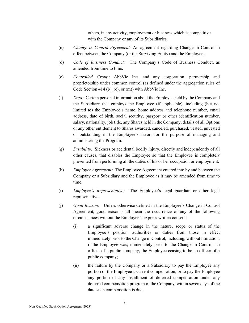 2 Non-Qualified Stock Option Agreement (2023) others, in any activity, employment or business which is competitive with the Company or any of its Subsidiaries. (c) Change in Control Agreement: An agreement regarding Change in Control in effect between the Company (or the Surviving Entity) and the Employee. (d) Code of Business Conduct: The Company’s Code of Business Conduct, as amended from time to time. (e) Controlled Group: AbbVie Inc. and any corporation, partnership and proprietorship under common control (as defined under the aggregation rules of Code Section 414 (b), (c), or (m)) with AbbVie Inc. (f) Data: Certain personal information about the Employee held by the Company and the Subsidiary that employs the Employee (if applicable), including (but not limited to) the Employee’s name, home address and telephone number, email address, date of birth, social security, passport or other identification number, salary, nationality, job title, any Shares held in the Company, details of all Options or any other entitlement to Shares awarded, canceled, purchased, vested, unvested or outstanding in the Employee’s favor, for the purpose of managing and administering the Program. (g) Disability: Sickness or accidental bodily injury, directly and independently of all other causes, that disables the Employee so that the Employee is completely prevented from performing all the duties of his or her occupation or employment. (h) Employee Agreement: The Employee Agreement entered into by and between the Company or a Subsidiary and the Employee as it may be amended from time to time. (i) Employee’s Representative: The Employee’s legal guardian or other legal representative. (j) Good Reason: Unless otherwise defined in the Employee’s Change in Control Agreement, good reason shall mean the occurrence of any of the following circumstances without the Employee’s express written consent: (i) a significant adverse change in the nature, scope or status of the Employee’s position, authorities or duties from those in effect immediately prior to the Change in Control, including, without limitation, if the Employee was, immediately prior to the Change in Control, an officer of a public company, the Employee ceasing to be an officer of a public company; (ii) the failure by the Company or a Subsidiary to pay the Employee any portion of the Employee’s current compensation, or to pay the Employee any portion of any installment of deferred compensation under any deferred compensation program of the Company, within seven days of the date such compensation is due;