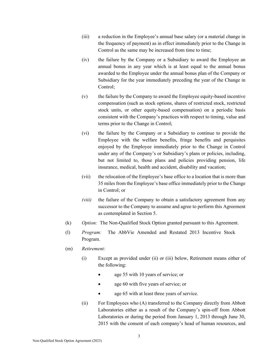3 Non-Qualified Stock Option Agreement (2023) (iii) a reduction in the Employee’s annual base salary (or a material change in the frequency of payment) as in effect immediately prior to the Change in Control as the same may be increased from time to time; (iv) the failure by the Company or a Subsidiary to award the Employee an annual bonus in any year which is at least equal to the annual bonus awarded to the Employee under the annual bonus plan of the Company or Subsidiary for the year immediately preceding the year of the Change in Control; (v) the failure by the Company to award the Employee equity-based incentive compensation (such as stock options, shares of restricted stock, restricted stock units, or other equity-based compensation) on a periodic basis consistent with the Company’s practices with respect to timing, value and terms prior to the Change in Control; (vi) the failure by the Company or a Subsidiary to continue to provide the Employee with the welfare benefits, fringe benefits and perquisites enjoyed by the Employee immediately prior to the Change in Control under any of the Company’s or Subsidiary’s plans or policies, including, but not limited to, those plans and policies providing pension, life insurance, medical, health and accident, disability and vacation; (vii) the relocation of the Employee’s base office to a location that is more than 35 miles from the Employee’s base office immediately prior to the Change in Control; or (viii) the failure of the Company to obtain a satisfactory agreement from any successor to the Company to assume and agree to perform this Agreement as contemplated in Section 5. (k) Option: The Non-Qualified Stock Option granted pursuant to this Agreement. (l) Program: The AbbVie Amended and Restated 2013 Incentive Stock Program. (m) Retirement: (i) Except as provided under (ii) or (iii) below, Retirement means either of the following: age 55 with 10 years of service; or age 60 with five years of service; or age 65 with at least three years of service. (ii) For Employees who (A) transferred to the Company directly from Abbott Laboratories either as a result of the Company’s spin-off from Abbott Laboratories or during the period from January 1, 2013 through June 30, 2015 with the consent of each company’s head of human resources, and