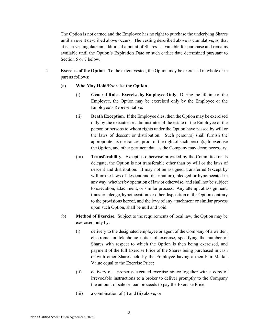 5 Non-Qualified Stock Option Agreement (2023) The Option is not earned and the Employee has no right to purchase the underlying Shares until an event described above occurs. The vesting described above is cumulative, so that at each vesting date an additional amount of Shares is available for purchase and remains available until the Option’s Expiration Date or such earlier date determined pursuant to Section 5 or 7 below. 4. Exercise of the Option. To the extent vested, the Option may be exercised in whole or in part as follows: (a) Who May Hold/Exercise the Option. (i) General Rule - Exercise by Employee Only. During the lifetime of the Employee, the Option may be exercised only by the Employee or the Employee’s Representative. (ii) Death Exception. If the Employee dies, then the Option may be exercised only by the executor or administrator of the estate of the Employee or the person or persons to whom rights under the Option have passed by will or the laws of descent or distribution. Such person(s) shall furnish the appropriate tax clearances, proof of the right of such person(s) to exercise the Option, and other pertinent data as the Company may deem necessary. (iii) Transferability. Except as otherwise provided by the Committee or its delegate, the Option is not transferable other than by will or the laws of descent and distribution. It may not be assigned, transferred (except by will or the laws of descent and distribution), pledged or hypothecated in any way, whether by operation of law or otherwise, and shall not be subject to execution, attachment, or similar process. Any attempt at assignment, transfer, pledge, hypothecation, or other disposition of the Option contrary to the provisions hereof, and the levy of any attachment or similar process upon such Option, shall be null and void. (b) Method of Exercise. Subject to the requirements of local law, the Option may be exercised only by: (i) delivery to the designated employee or agent of the Company of a written, electronic, or telephonic notice of exercise, specifying the number of Shares with respect to which the Option is then being exercised, and payment of the full Exercise Price of the Shares being purchased in cash or with other Shares held by the Employee having a then Fair Market Value equal to the Exercise Price; (ii) delivery of a properly-executed exercise notice together with a copy of irrevocable instructions to a broker to deliver promptly to the Company the amount of sale or loan proceeds to pay the Exercise Price; (iii) a combination of (i) and (ii) above; or