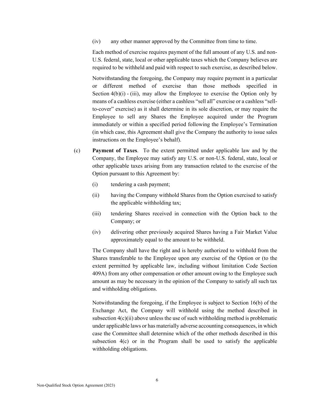 6 Non-Qualified Stock Option Agreement (2023) (iv) any other manner approved by the Committee from time to time. Each method of exercise requires payment of the full amount of any U.S. and non- U.S. federal, state, local or other applicable taxes which the Company believes are required to be withheld and paid with respect to such exercise, as described below. Notwithstanding the foregoing, the Company may require payment in a particular or different method of exercise than those methods specified in Section 4(b)(i) - (iii), may allow the Employee to exercise the Option only by means of a cashless exercise (either a cashless “sell all” exercise or a cashless “sell- to-cover” exercise) as it shall determine in its sole discretion, or may require the Employee to sell any Shares the Employee acquired under the Program immediately or within a specified period following the Employee’s Termination (in which case, this Agreement shall give the Company the authority to issue sales instructions on the Employee’s behalf). (c) Payment of Taxes. To the extent permitted under applicable law and by the Company, the Employee may satisfy any U.S. or non-U.S. federal, state, local or other applicable taxes arising from any transaction related to the exercise of the Option pursuant to this Agreement by: (i) tendering a cash payment; (ii) having the Company withhold Shares from the Option exercised to satisfy the applicable withholding tax; (iii) tendering Shares received in connection with the Option back to the Company; or (iv) delivering other previously acquired Shares having a Fair Market Value approximately equal to the amount to be withheld. The Company shall have the right and is hereby authorized to withhold from the Shares transferable to the Employee upon any exercise of the Option or (to the extent permitted by applicable law, including without limitation Code Section 409A) from any other compensation or other amount owing to the Employee such amount as may be necessary in the opinion of the Company to satisfy all such tax and withholding obligations. Notwithstanding the foregoing, if the Employee is subject to Section 16(b) of the Exchange Act, the Company will withhold using the method described in subsection 4(c)(ii) above unless the use of such withholding method is problematic under applicable laws or has materially adverse accounting consequences, in which case the Committee shall determine which of the other methods described in this subsection 4(c) or in the Program shall be used to satisfy the applicable withholding obligations.