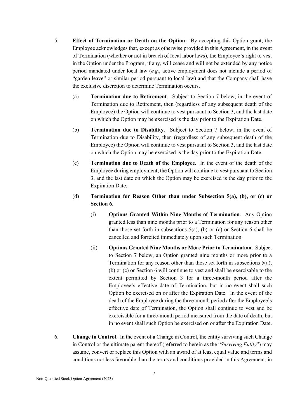 7 Non-Qualified Stock Option Agreement (2023) 5. Effect of Termination or Death on the Option. By accepting this Option grant, the Employee acknowledges that, except as otherwise provided in this Agreement, in the event of Termination (whether or not in breach of local labor laws), the Employee’s right to vest in the Option under the Program, if any, will cease and will not be extended by any notice period mandated under local law (e.g., active employment does not include a period of “garden leave” or similar period pursuant to local law) and that the Company shall have the exclusive discretion to determine Termination occurs. (a) Termination due to Retirement. Subject to Section 7 below, in the event of Termination due to Retirement, then (regardless of any subsequent death of the Employee) the Option will continue to vest pursuant to Section 3, and the last date on which the Option may be exercised is the day prior to the Expiration Date. (b) Termination due to Disability. Subject to Section 7 below, in the event of Termination due to Disability, then (regardless of any subsequent death of the Employee) the Option will continue to vest pursuant to Section 3, and the last date on which the Option may be exercised is the day prior to the Expiration Date. (c) Termination due to Death of the Employee. In the event of the death of the Employee during employment, the Option will continue to vest pursuant to Section 3, and the last date on which the Option may be exercised is the day prior to the Expiration Date. (d) Termination for Reason Other than under Subsection 5(a), (b), or (c) or Section 6. (i) Options Granted Within Nine Months of Termination. Any Option granted less than nine months prior to a Termination for any reason other than those set forth in subsections 5(a), (b) or (c) or Section 6 shall be cancelled and forfeited immediately upon such Termination. (ii) Options Granted Nine Months or More Prior to Termination. Subject to Section 7 below, an Option granted nine months or more prior to a Termination for any reason other than those set forth in subsections 5(a), (b) or (c) or Section 6 will continue to vest and shall be exercisable to the extent permitted by Section 3 for a three-month period after the Employee’s effective date of Termination, but in no event shall such Option be exercised on or after the Expiration Date. In the event of the death of the Employee during the three-month period after the Employee’s effective date of Termination, the Option shall continue to vest and be exercisable for a three-month period measured from the date of death, but in no event shall such Option be exercised on or after the Expiration Date. 6. Change in Control. In the event of a Change in Control, the entity surviving such Change in Control or the ultimate parent thereof (referred to herein as the “Surviving Entity”) may assume, convert or replace this Option with an award of at least equal value and terms and conditions not less favorable than the terms and conditions provided in this Agreement, in