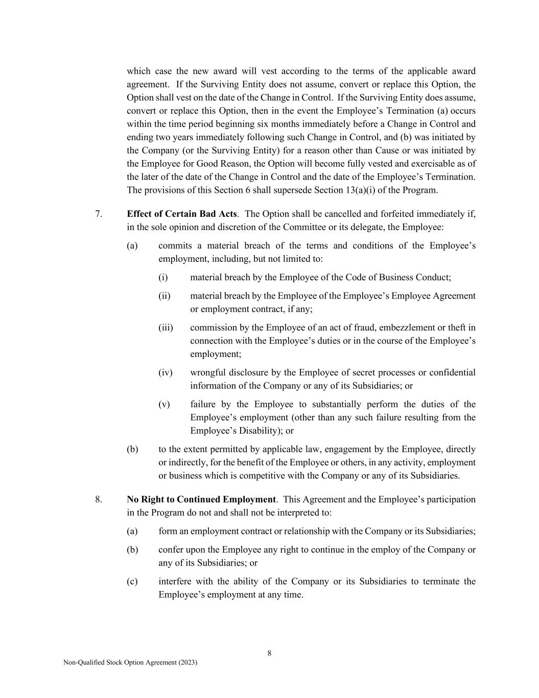 8 Non-Qualified Stock Option Agreement (2023) which case the new award will vest according to the terms of the applicable award agreement. If the Surviving Entity does not assume, convert or replace this Option, the Option shall vest on the date of the Change in Control. If the Surviving Entity does assume, convert or replace this Option, then in the event the Employee’s Termination (a) occurs within the time period beginning six months immediately before a Change in Control and ending two years immediately following such Change in Control, and (b) was initiated by the Company (or the Surviving Entity) for a reason other than Cause or was initiated by the Employee for Good Reason, the Option will become fully vested and exercisable as of the later of the date of the Change in Control and the date of the Employee’s Termination. The provisions of this Section 6 shall supersede Section 13(a)(i) of the Program. 7. Effect of Certain Bad Acts. The Option shall be cancelled and forfeited immediately if, in the sole opinion and discretion of the Committee or its delegate, the Employee: (a) commits a material breach of the terms and conditions of the Employee’s employment, including, but not limited to: (i) material breach by the Employee of the Code of Business Conduct; (ii) material breach by the Employee of the Employee’s Employee Agreement or employment contract, if any; (iii) commission by the Employee of an act of fraud, embezzlement or theft in connection with the Employee’s duties or in the course of the Employee’s employment; (iv) wrongful disclosure by the Employee of secret processes or confidential information of the Company or any of its Subsidiaries; or (v) failure by the Employee to substantially perform the duties of the Employee’s employment (other than any such failure resulting from the Employee’s Disability); or (b) to the extent permitted by applicable law, engagement by the Employee, directly or indirectly, for the benefit of the Employee or others, in any activity, employment or business which is competitive with the Company or any of its Subsidiaries. 8. No Right to Continued Employment. This Agreement and the Employee’s participation in the Program do not and shall not be interpreted to: (a) form an employment contract or relationship with the Company or its Subsidiaries; (b) confer upon the Employee any right to continue in the employ of the Company or any of its Subsidiaries; or (c) interfere with the ability of the Company or its Subsidiaries to terminate the Employee’s employment at any time.